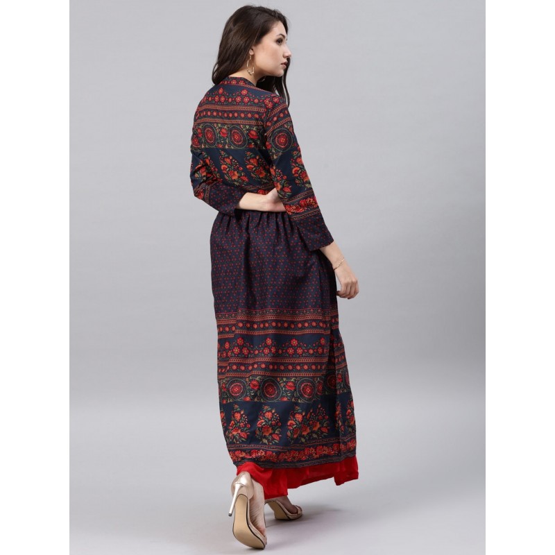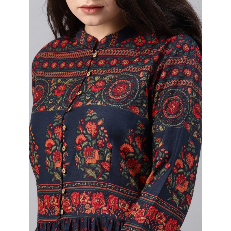 Индийская туника анаркали синяя с цветочным принтом. Туника имеет А-силуэт, китайский воротничок с планкой с декоративными пуговицами (можно расстегнуть полностью), высокий вырез спереди, рукава три четверти.