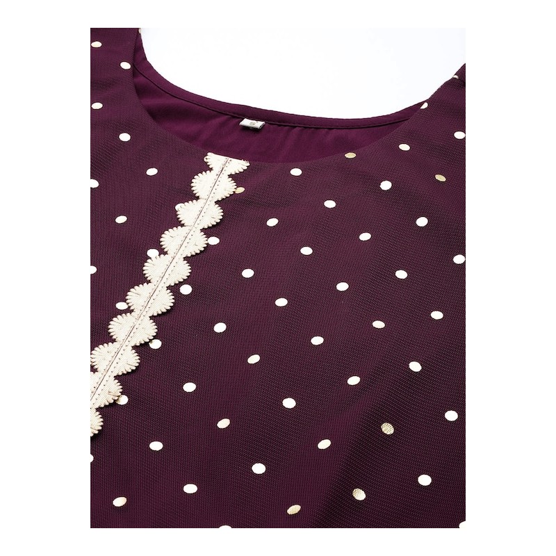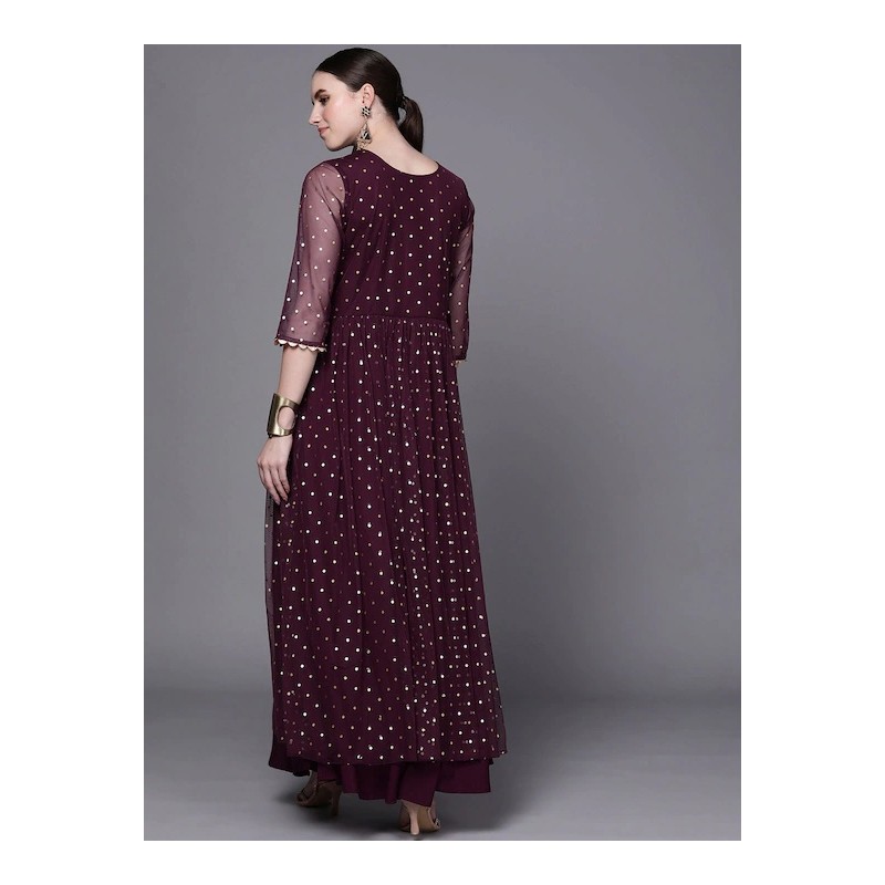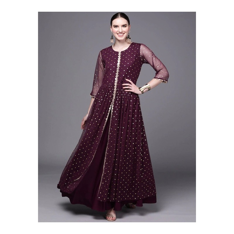 Индийское длинное праздничное платье винного цвета в золотистый горох. У платья округлый ворот, золотистая тесьма, создающая красивую вертикаль на платье и декорирующая рукава. Многослойность - сверху сетка, внутри однотонная ткань, спереди разрез, красиво раскрывающийся при движении.