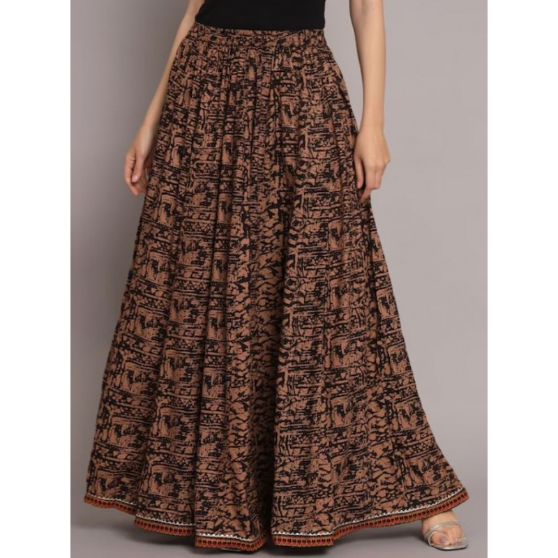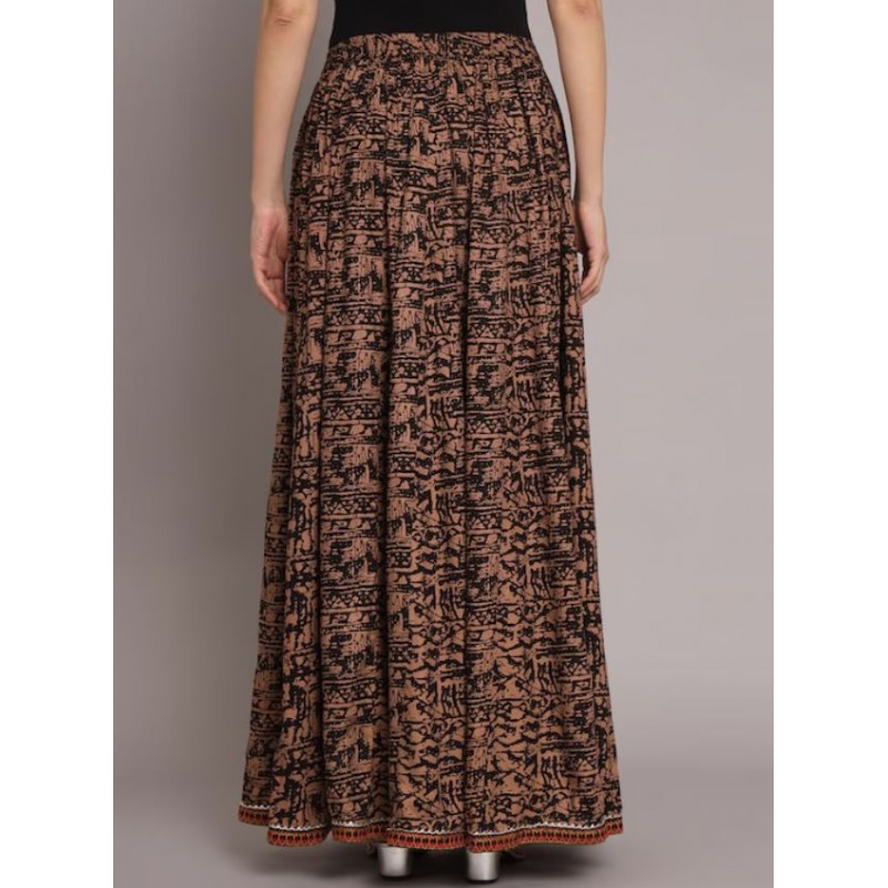Длинная коричневая юбка из Индии с черным абстрактным принтом и вышивкой нитью на подоле. На поясе резинка.