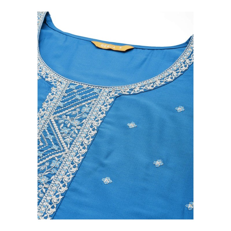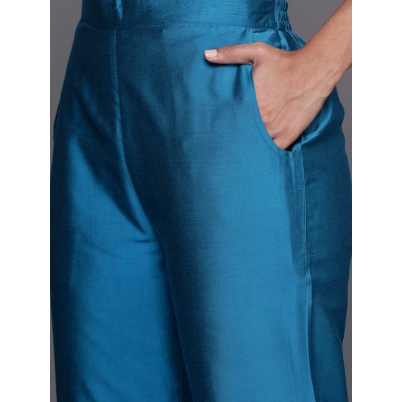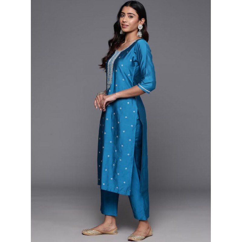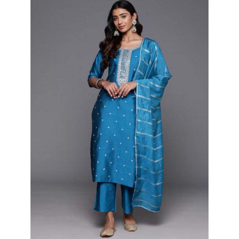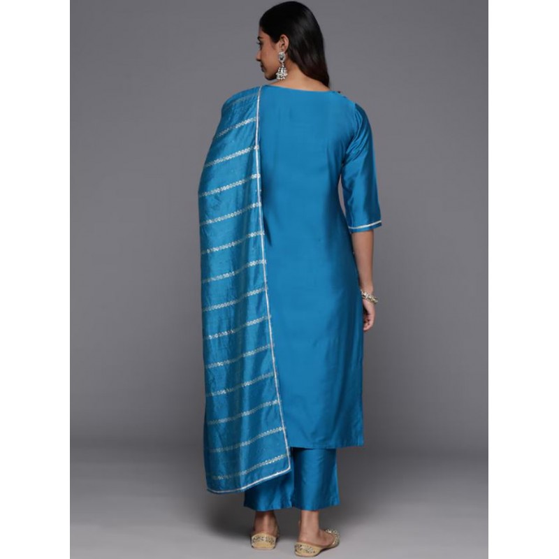 Индийский костюм сальвар камиз синий c изящной вышивкой золотыми нитями и мелкими пайетками: