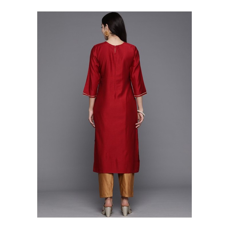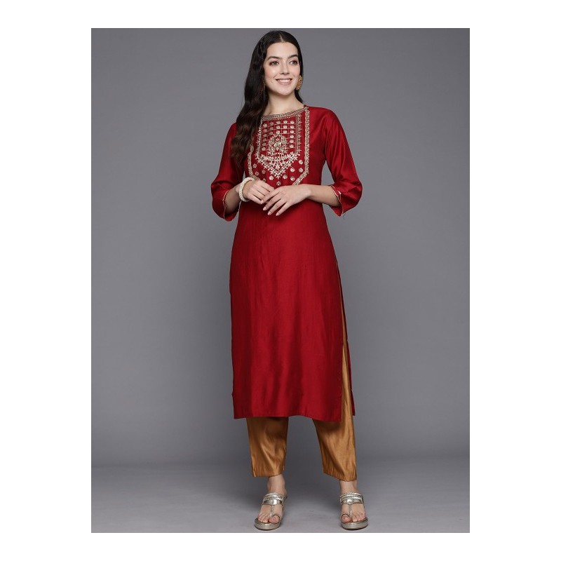 Дизайнерская индийская туника красного цвета с вышивкой золотой нитью и тесьмой. Туника имеет прямой силуэт, рукава три четверти, округлый ворот, разрезы по бокам.