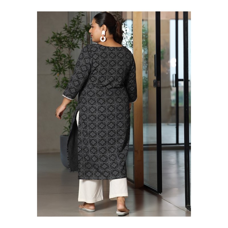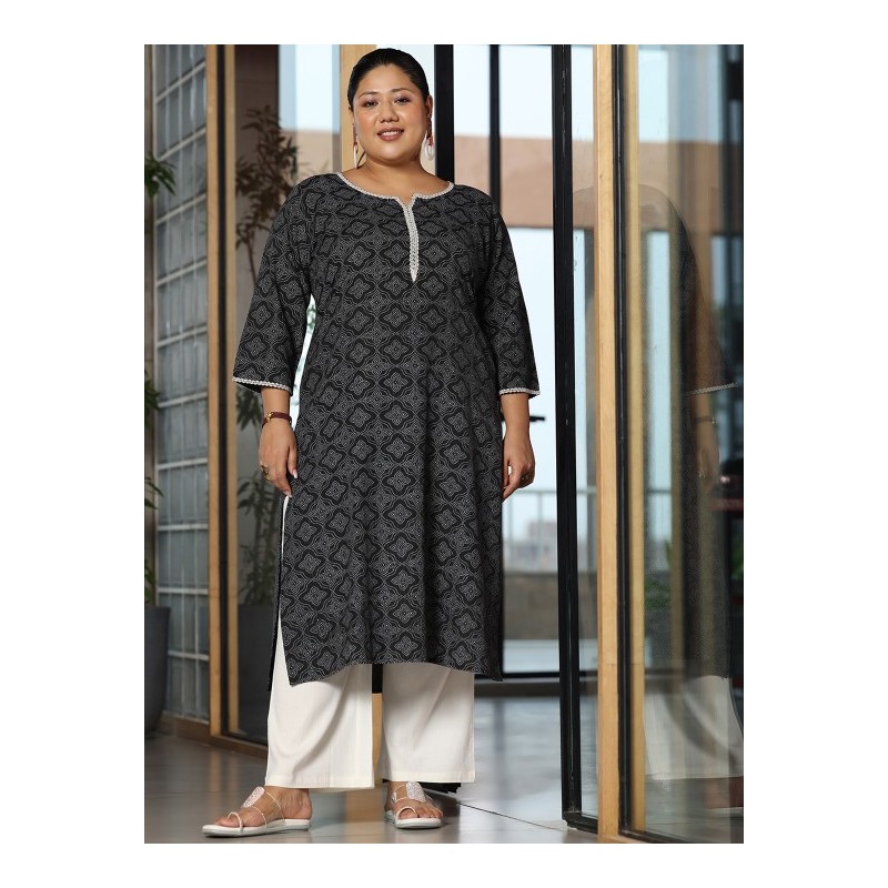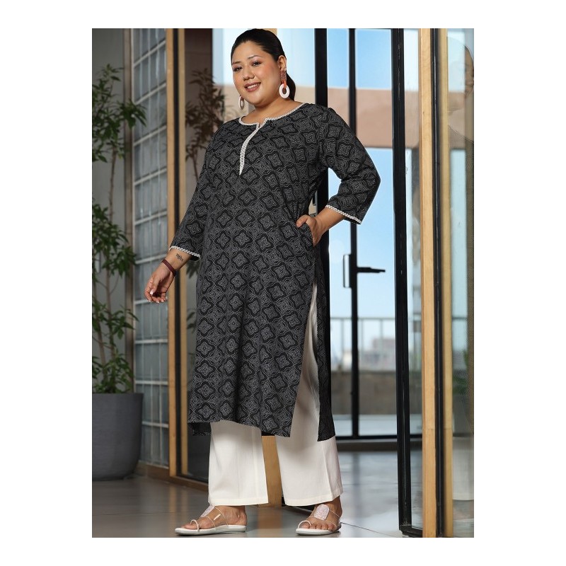 Индийская туника черная с белым этно принтом. По бокам разрезы, округлая горловина, украшенная белой тесьмой, рукава три четверти, карман сбоку.