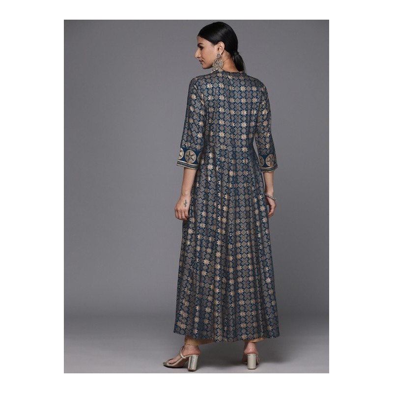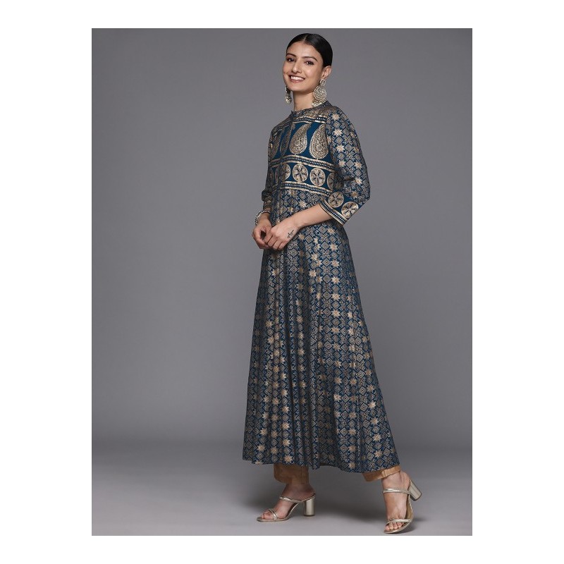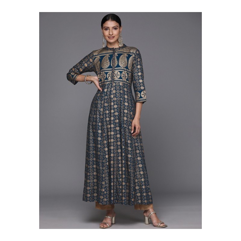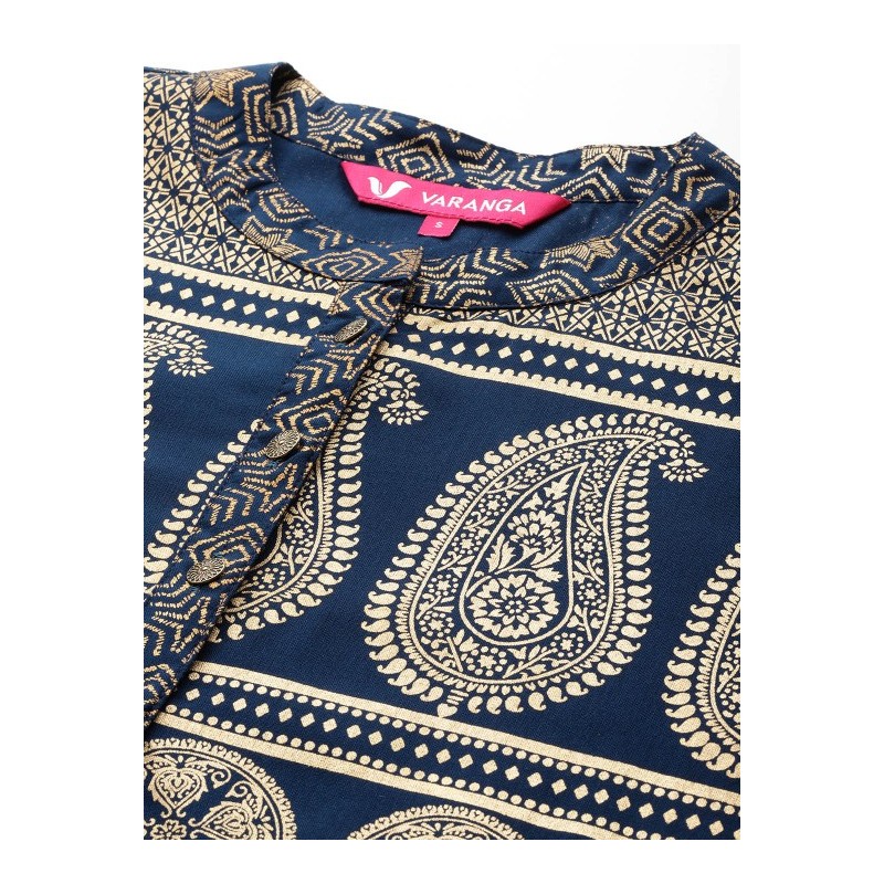Индийское платье синее с золотым печатным рисунком, с китайским воротничком, планкой с декоративными пуговицами. У платья А-силуэт, рукава три четверти.