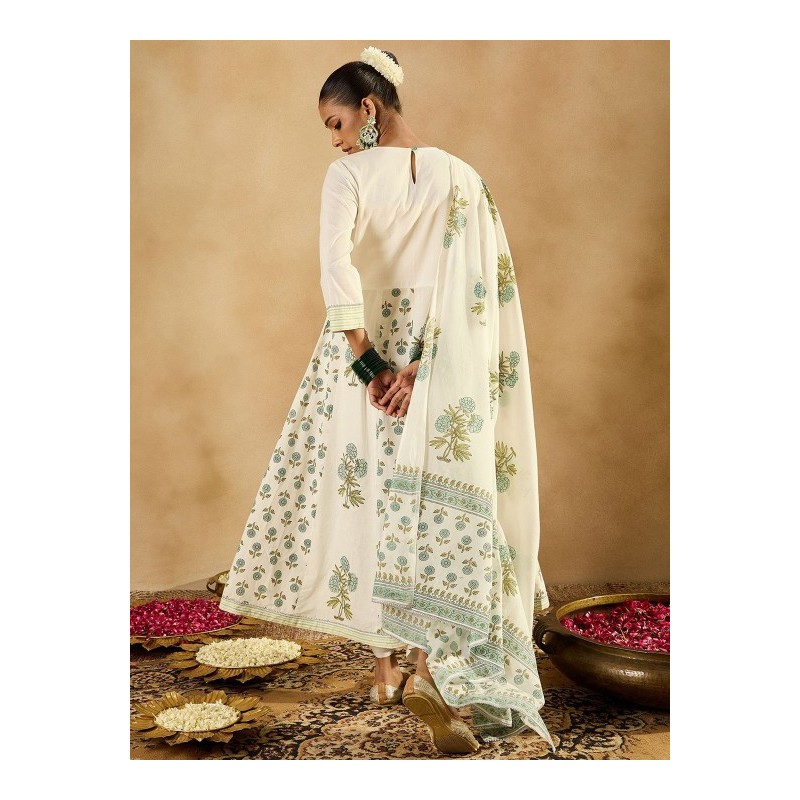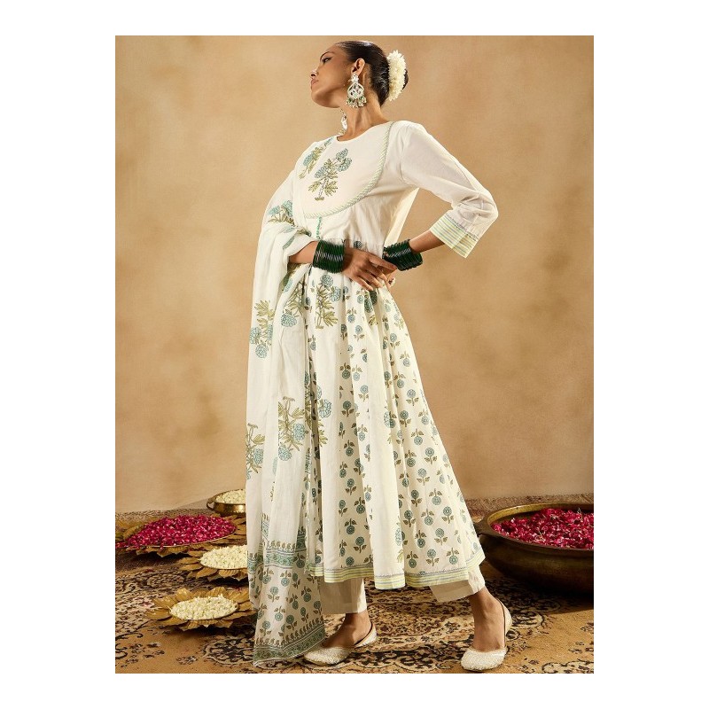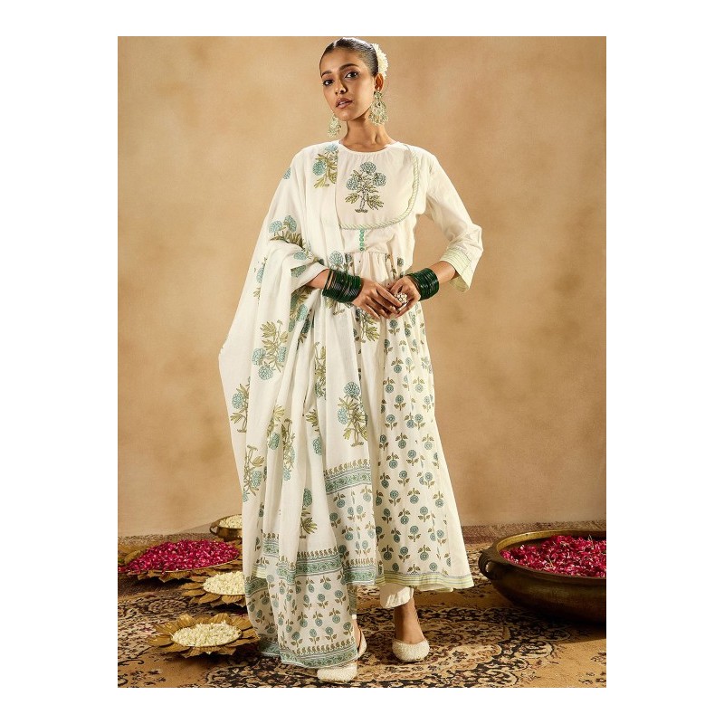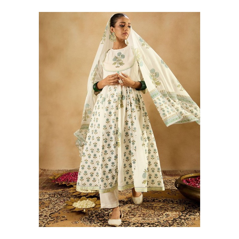1) индийская туника силуэта анаркали белая с голубыми цветами и вышивкой готта патти серебристой тесьмой, с вышивкой мелкими серебристыми пайетками на груди, имеет округлую горловину, рукава три четверти;