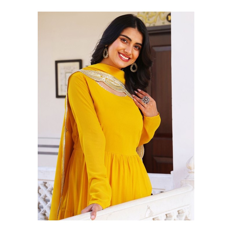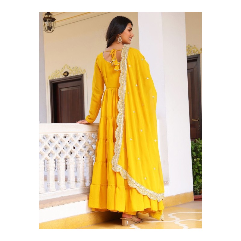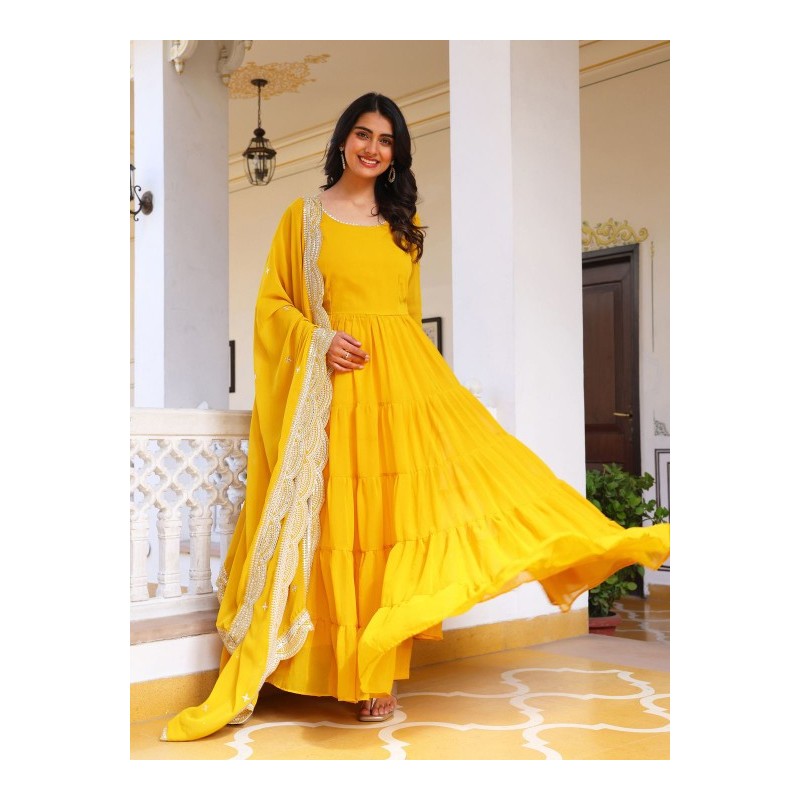 Длинное индийское платье желтое ярусное с пышной широкой юбкой. Платье имеет А-силуэт, округлый ворот, длинные рукава. У платья есть подкладка. В комплекте дупатта, обшитая по периметру золотистой дупаттой. В комплекте также прямые брюки в цвет на резинке.