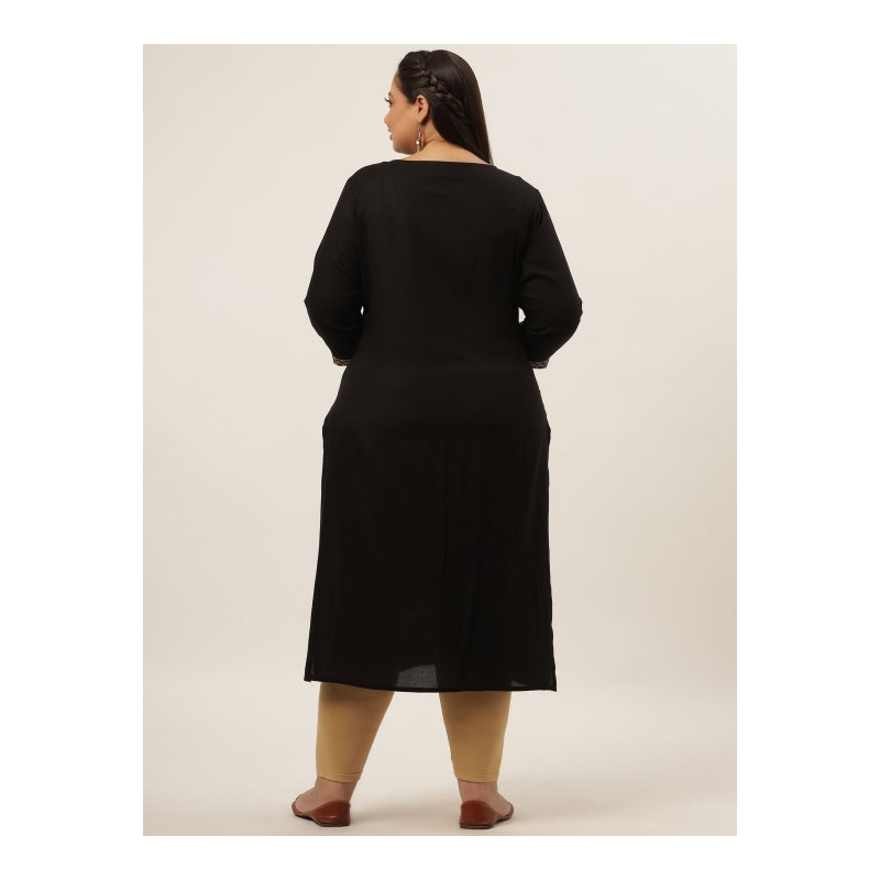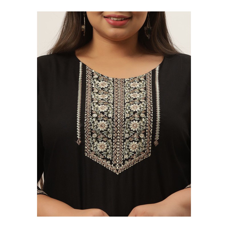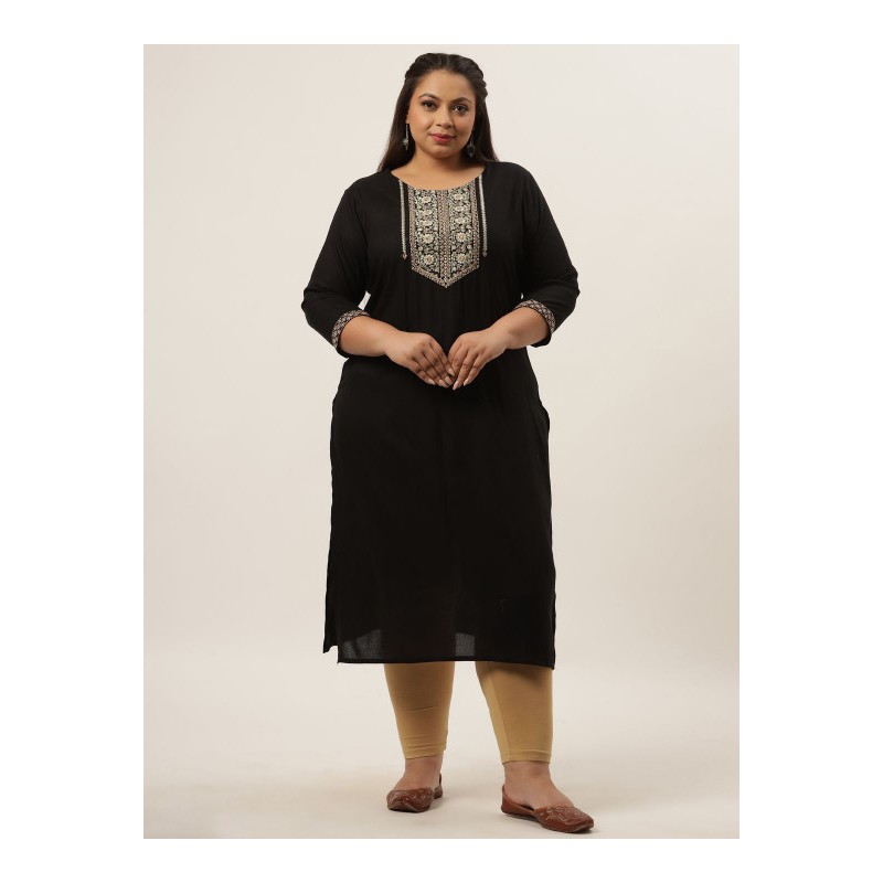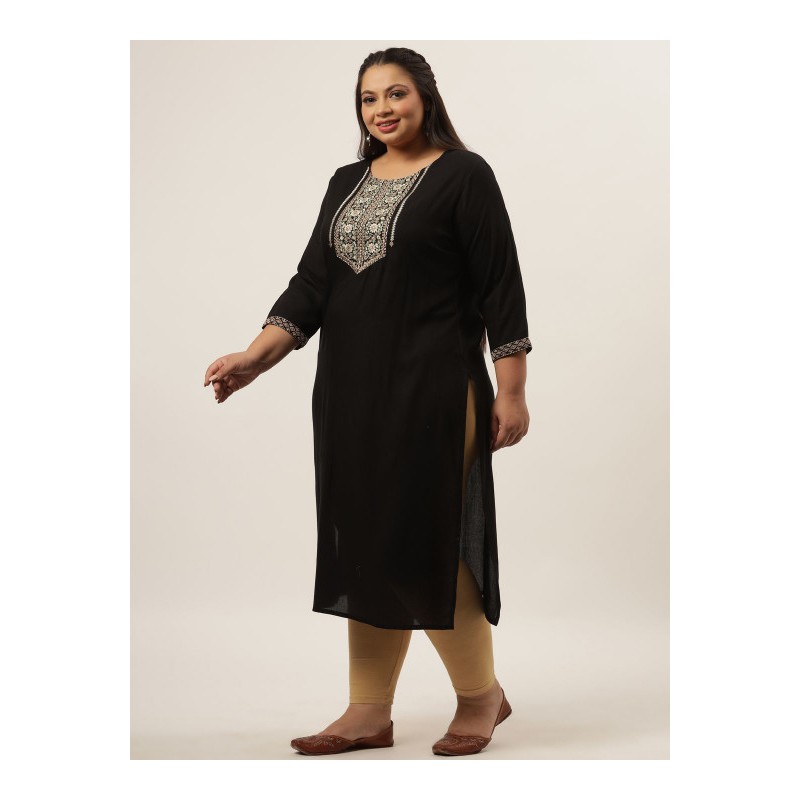 Индийская туника черного цвета с вышивкой цветными нитями. У туники прямой силуэт, по бокам разрезы, округлый ворот, рукава три четверти.
