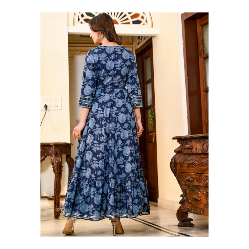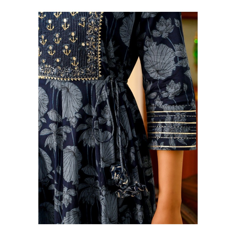 Индийское длинное платье синее с цветами, на груди вышивка цветными нитями, готта патти и имитацией раджастанских зеркалец (фольга). Платье имеет А-силуэт, округлый ворот, рукава три четверти, декоративные завязки по бокам.