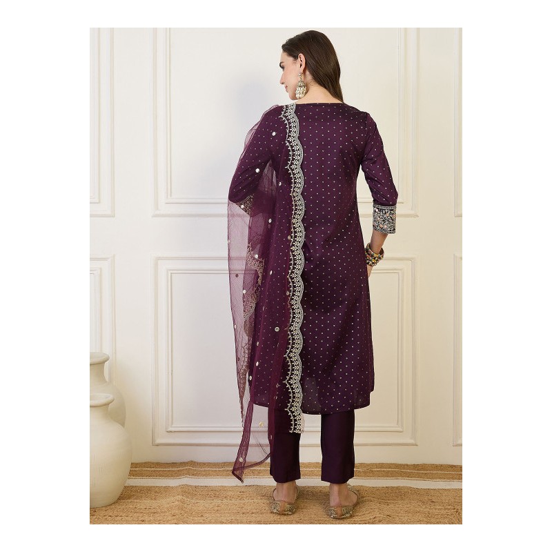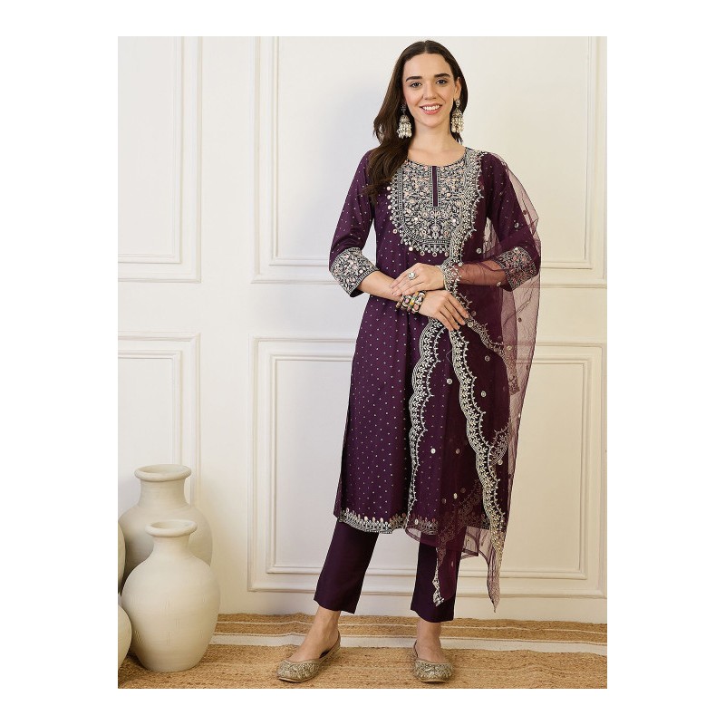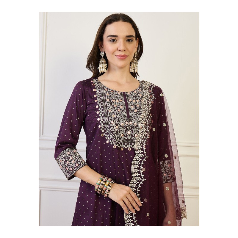 Индийский женский брючный костюм фиолетовый c изящной вышивкой цветными нитями и имитацией раджастанских зеркалец (фольга):