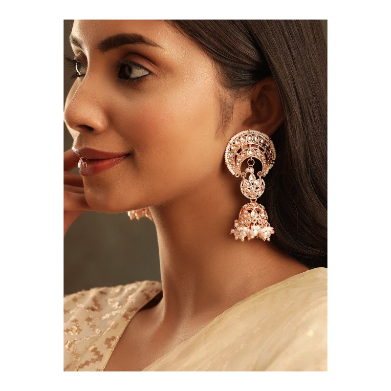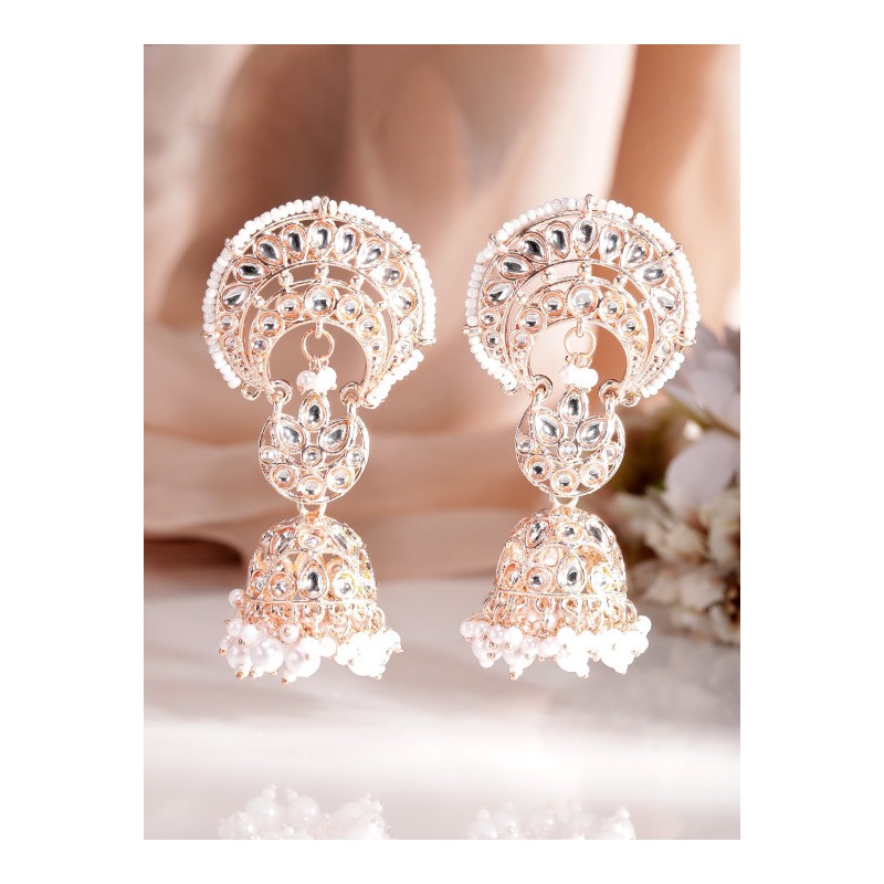 Крупные индийские серьги-джумки из бижутерного сплава под розовое золото, белыми стразами и искусственным жемчугом. Крепление - гвоздик.
