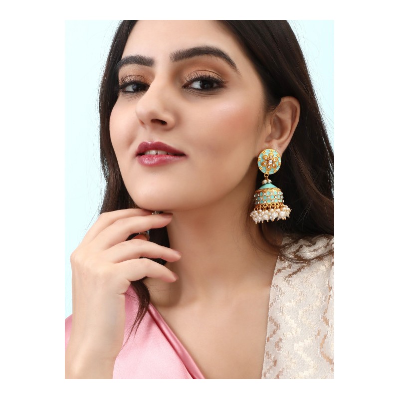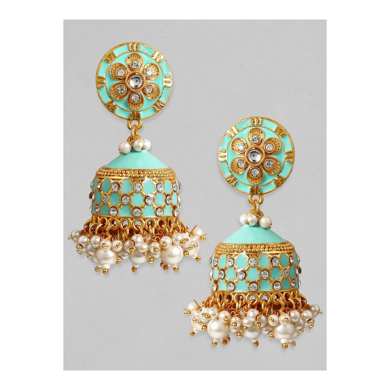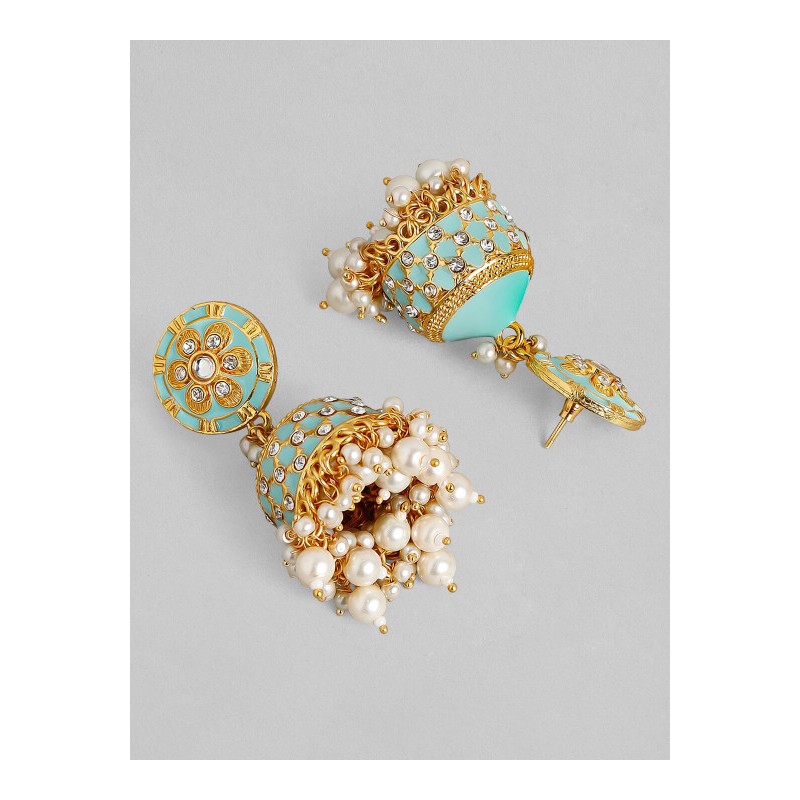 Крупные эффектные индийские серьги-джумки с бирюзовой эмалью, белыми стразами и искусственным жемчугом. Крепление - гвоздик.