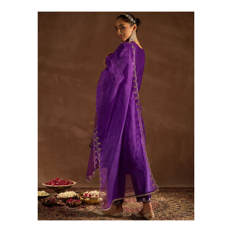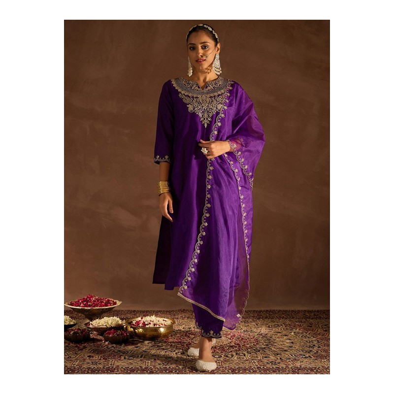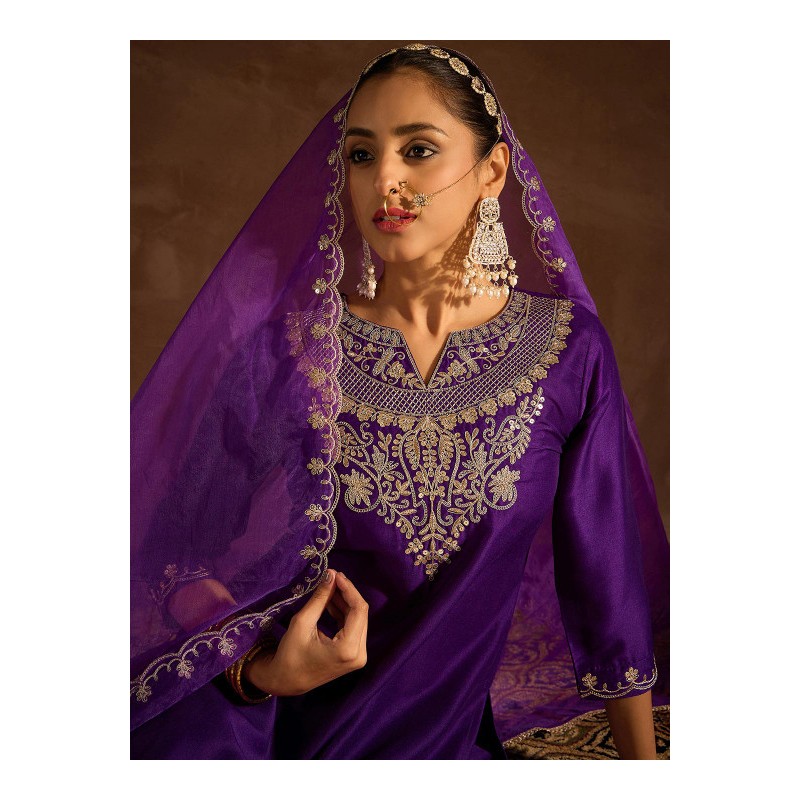 Индийский костюм сальвар камиз фиолетовый c изящной вышивкой золотистой нитью и мелкими пайетками: