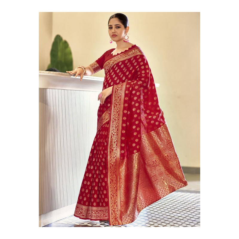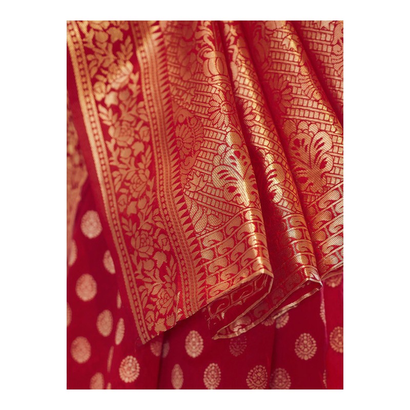 Индийское сари красного цвета с традиционным золотым узором (плетение ткани).