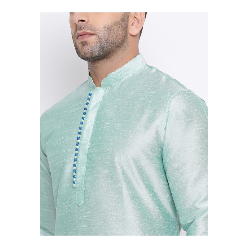1) светло зеленого цвета курта с китайским воротничком, скрытой планкой с крючками, с длинными рукавами, по бокам разрезы;