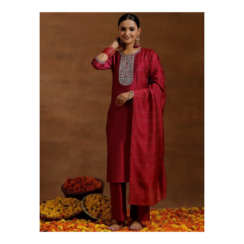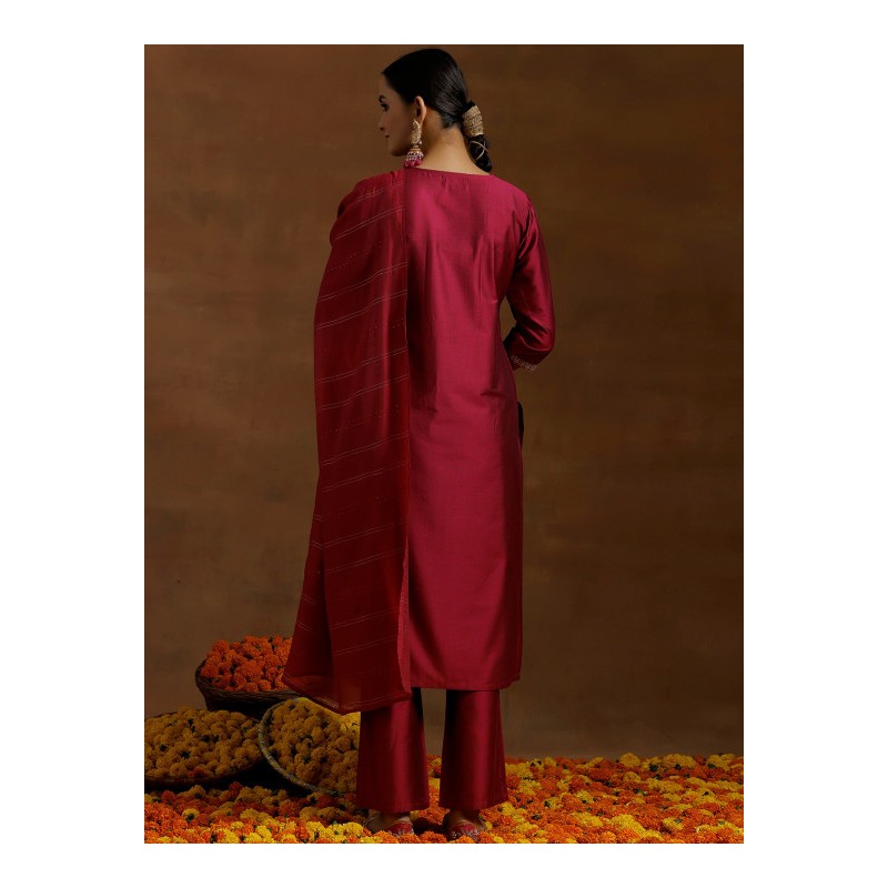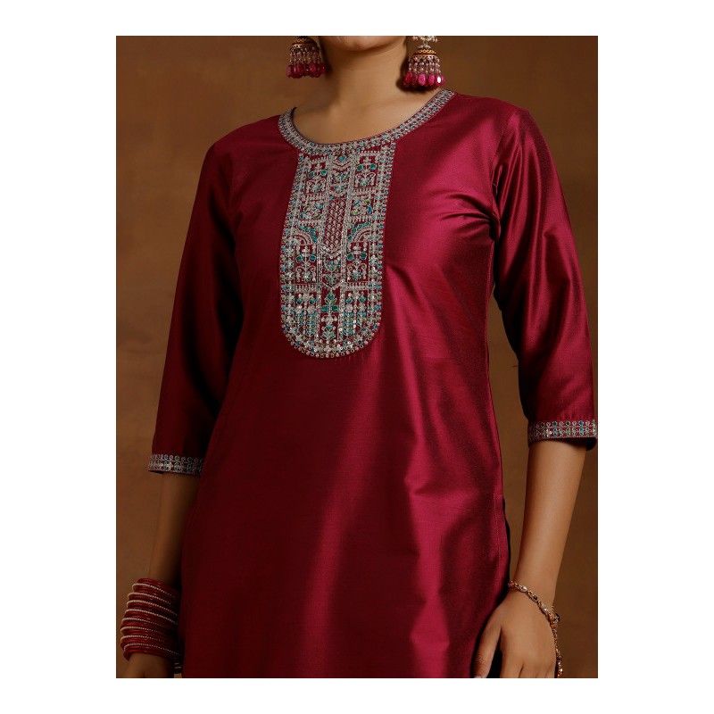 Индийский костюм сальвар камиз винный c изящной вышивкой цветными нитями и мелкими пайетками:
