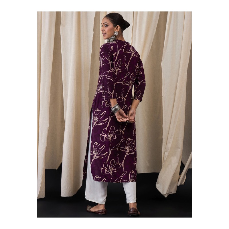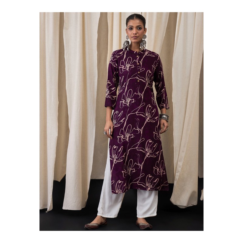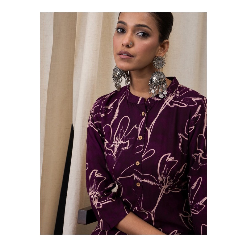 Индийская туника фиолетовая с белыми цветами. Туника имеет прямой силуэт, рукава три четверти, китайский воротничок с планкой с пуговицами, разрезы по бокам.