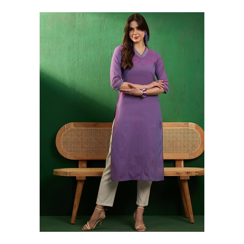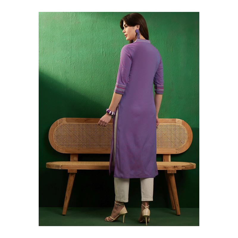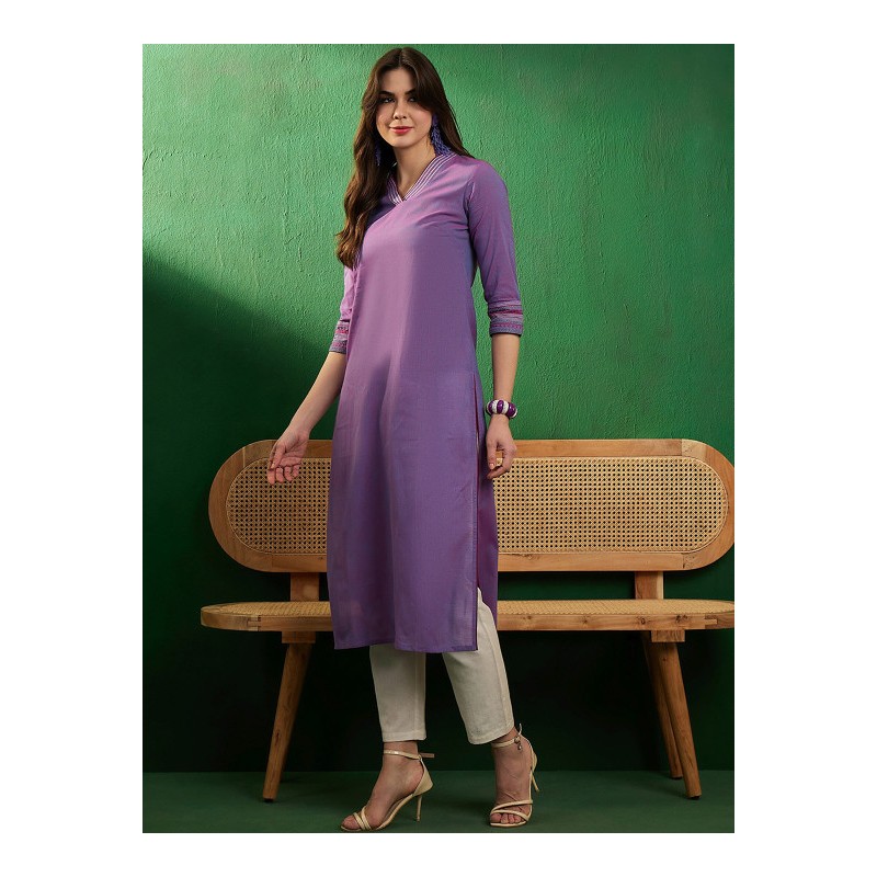 Дизайнерская индийская туника фиолетового цвета (эффект хамелиона от розового к голубому). Туника имеет прямой силуэт, V-ворот и рукава три четверти с отделкой бордовой каймой и вышивкой цветными нитями , разрезы по бокам.