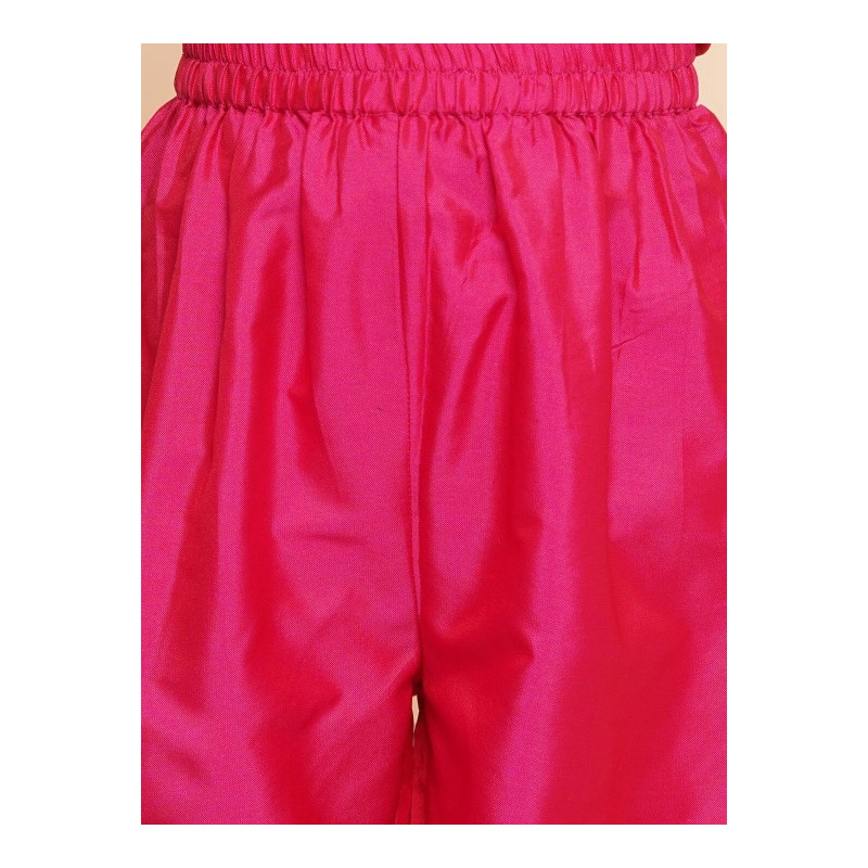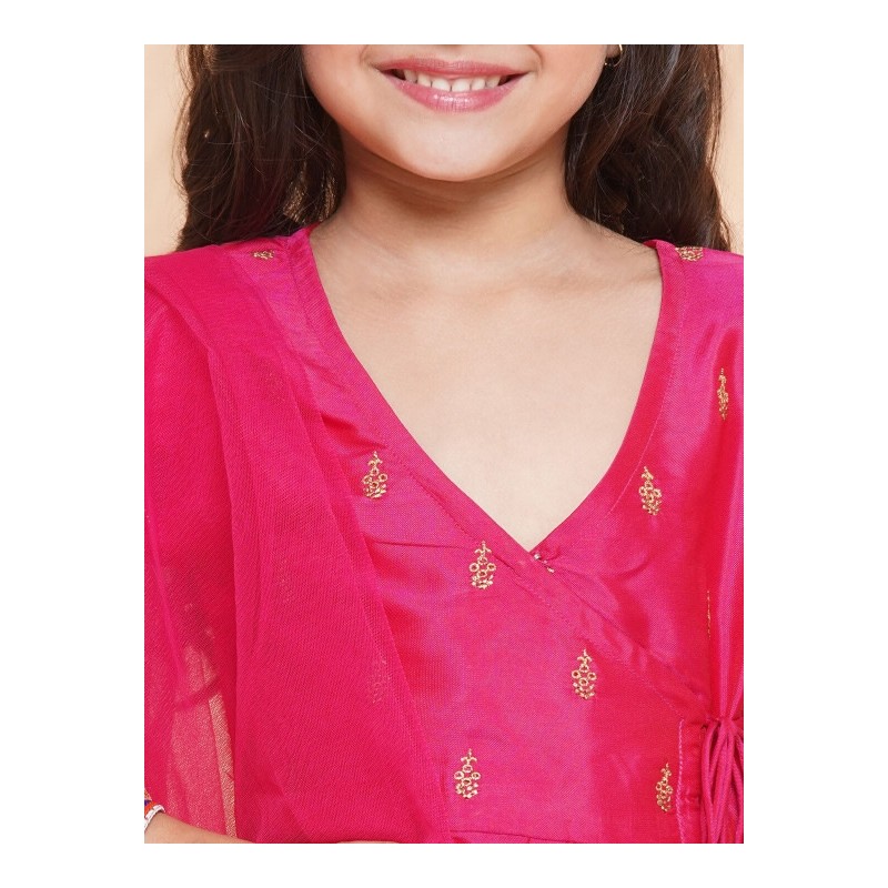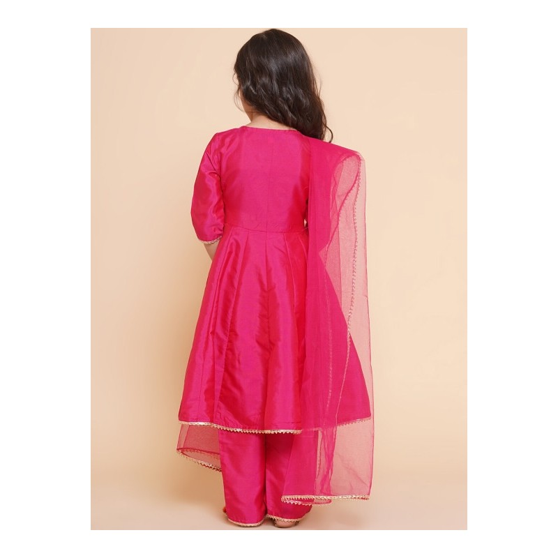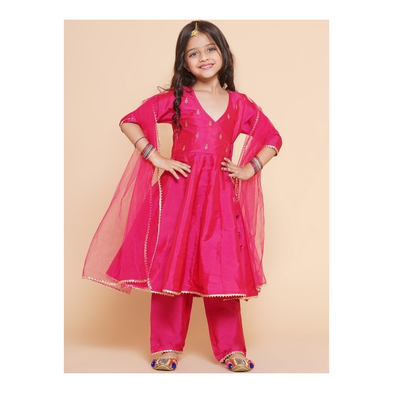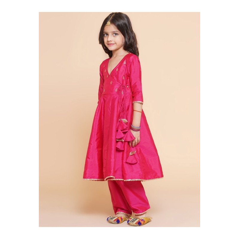 1) ярко розовая индийская туника анаркали А-силуэта, с имитацией запаха, вышивкой золотистой нитью и тесьмой;