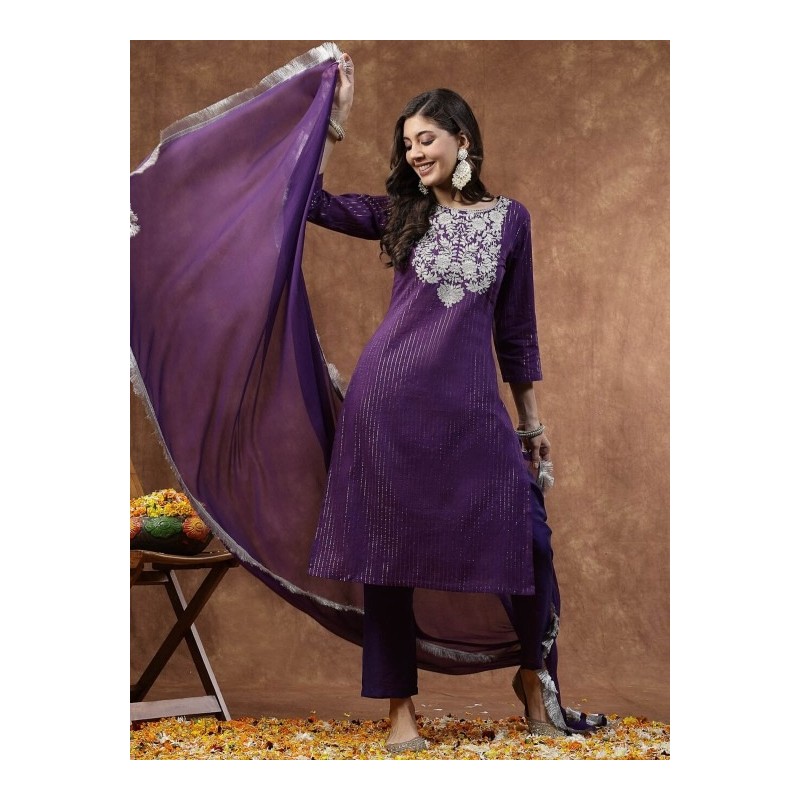 Индийский костюм сальвар камиз фиолетовый в золотую полоску c изящной вышивкой серебристой нитью у горловины: