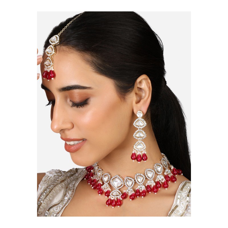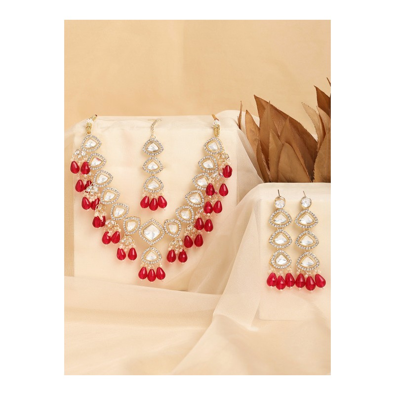 Металл - под золото. Камни белые, искусственный жемчуг, рубиновые бусины.