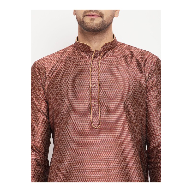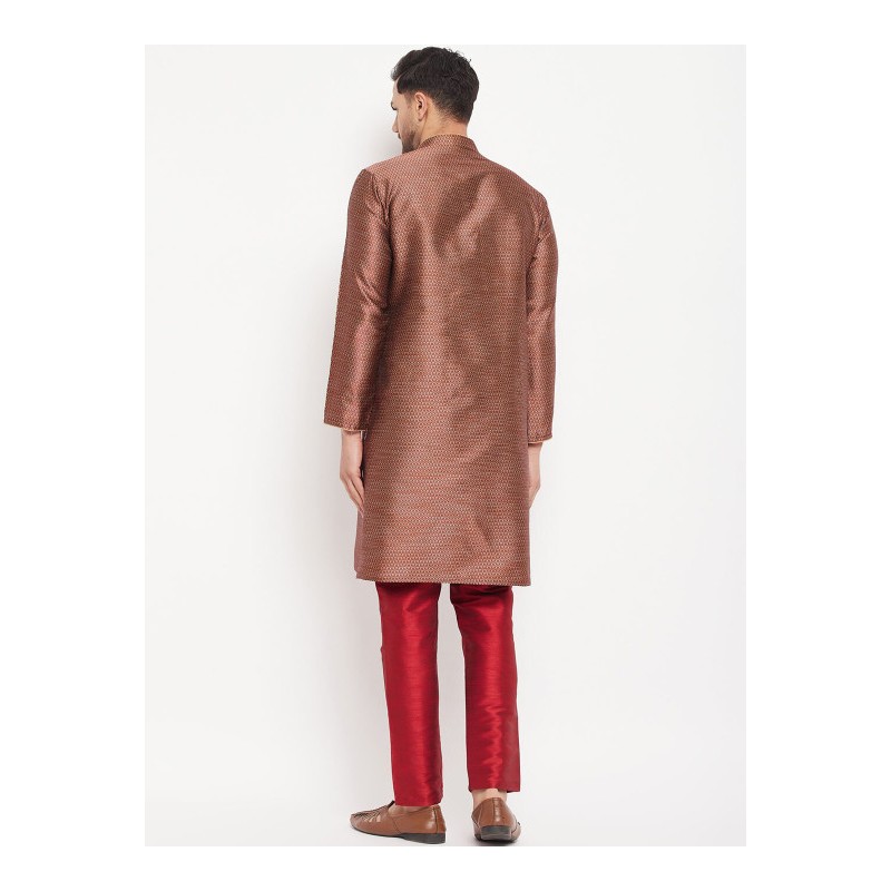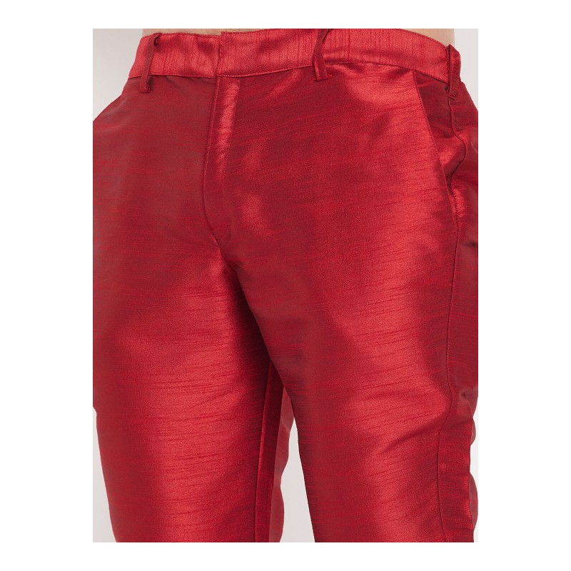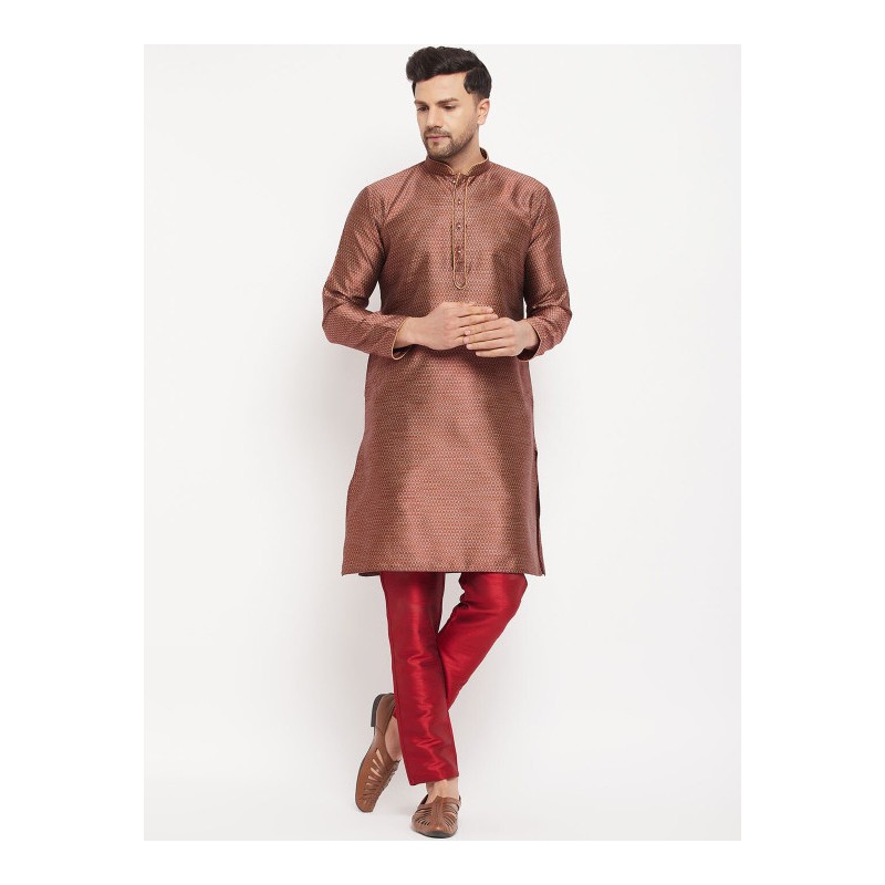 Индийская мужская курта выглядит празднично и элегантно. Имеет китайский воротничок, длинные рукава, разрезы по бокам, пара карманов. В комплекте к курте красные узкие брюки, на поясе сзади резинка для лучшей посадки, спереди пуговица и молния. У брюк на самом деле цвет более темный, не такой яркий как на фото.
