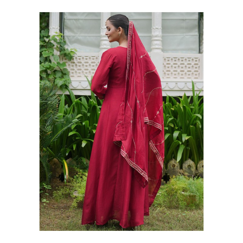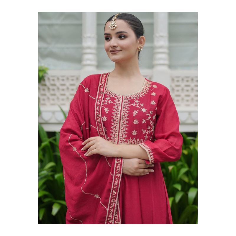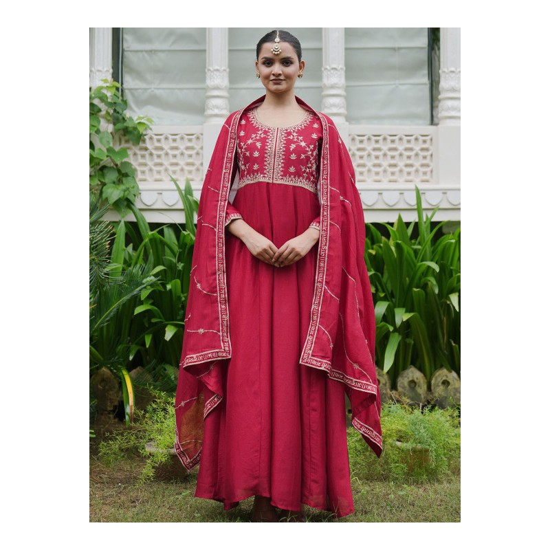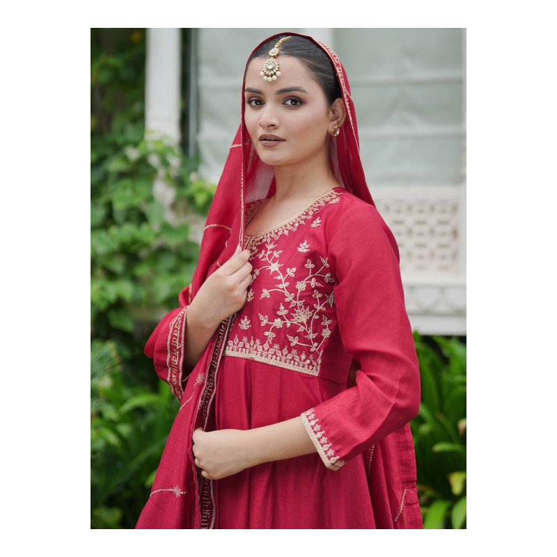 1) индийская туника силуэта анаркали красная с округлым воротом, украшенным вышивкой золотой нитью и пайетками, рукава три четверти;