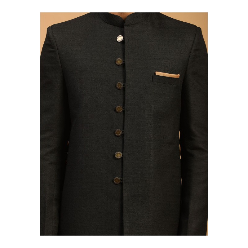 1) черного цвета пиджак шервани с золотыми пуговицами, с китайским воротничком, с длинными рукавами, по бокам разрезы, шервани расстегивается полностью как пиджак;