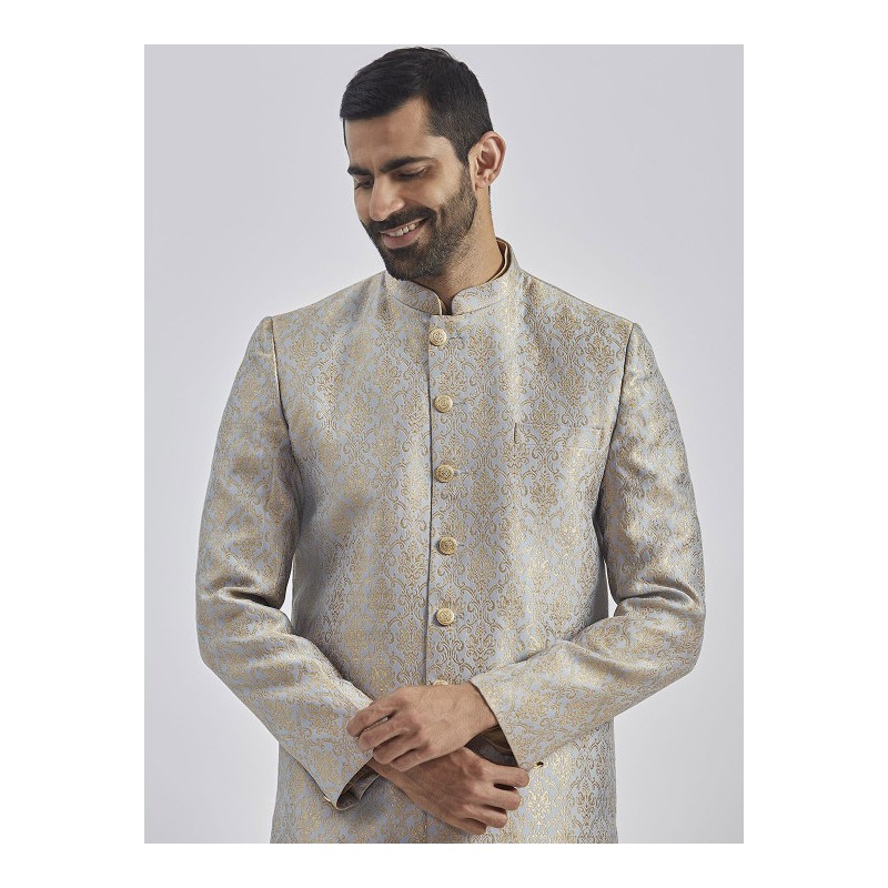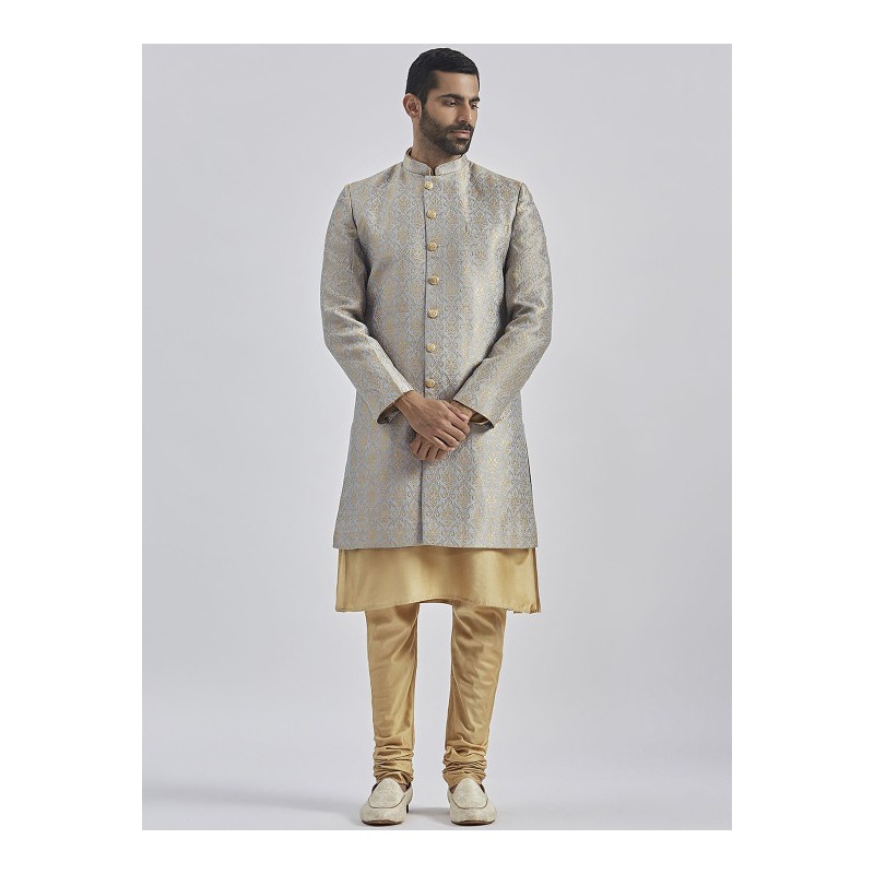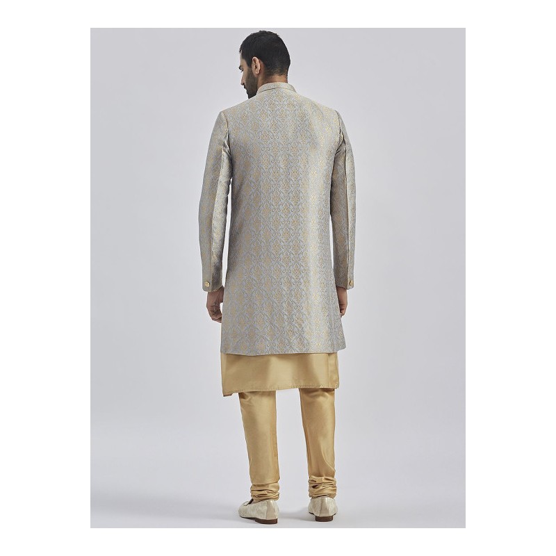 Светло серого цвета пиджак шервани с этно узорами золотой нитью, с китайским воротничком, с длинными рукавами, по бокам разрезы, планка с красивыми пуговицами, шервани расстегивается полностью как пиджак. Внутри золотисто бежевая базовая курта с китайским воротничком, пуговицами, длинными рукавами и разрезами по бокам. В комплекте также золотисто-бежевые брюки чуридары.