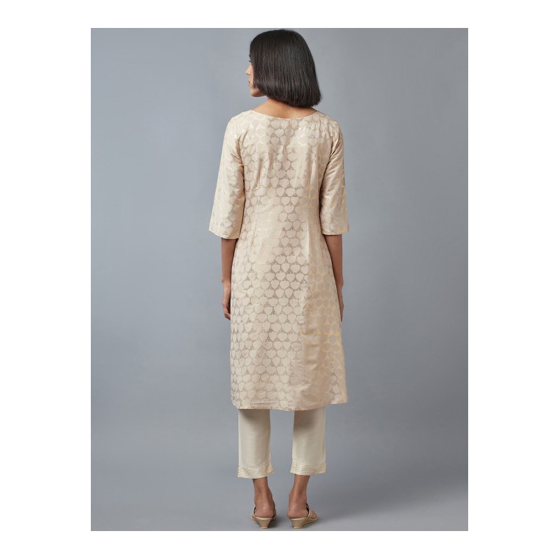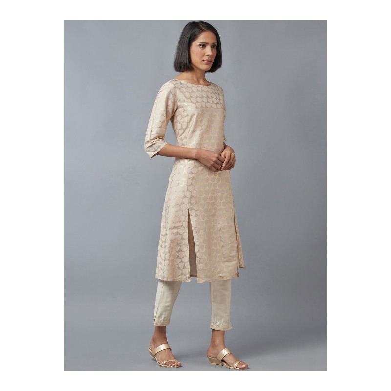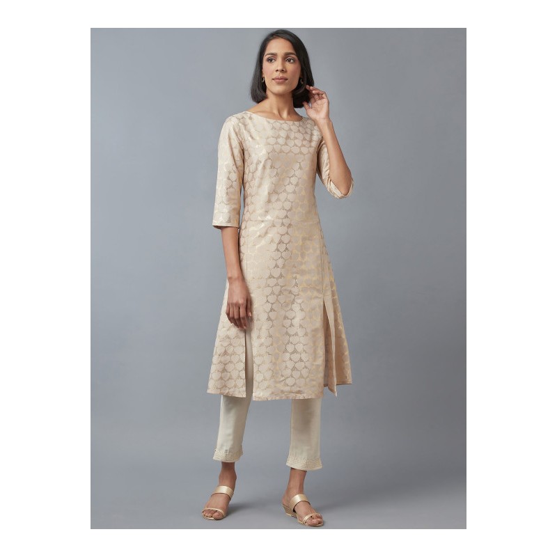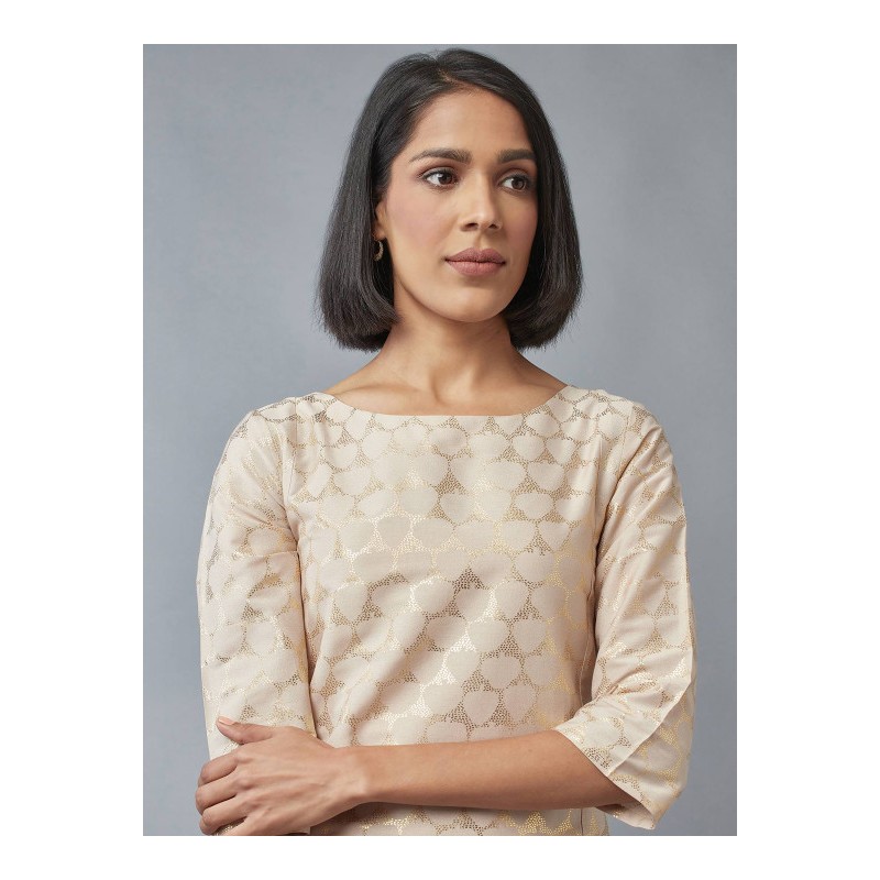 Индийская туника анаркали бежевая с золотым печатным рисунком. Туника имеет А-силуэт, округлый ворот, два разреза спереди, рукава три четверти.
