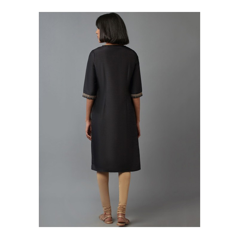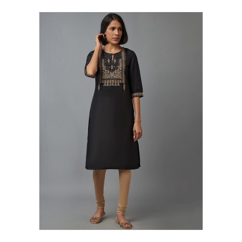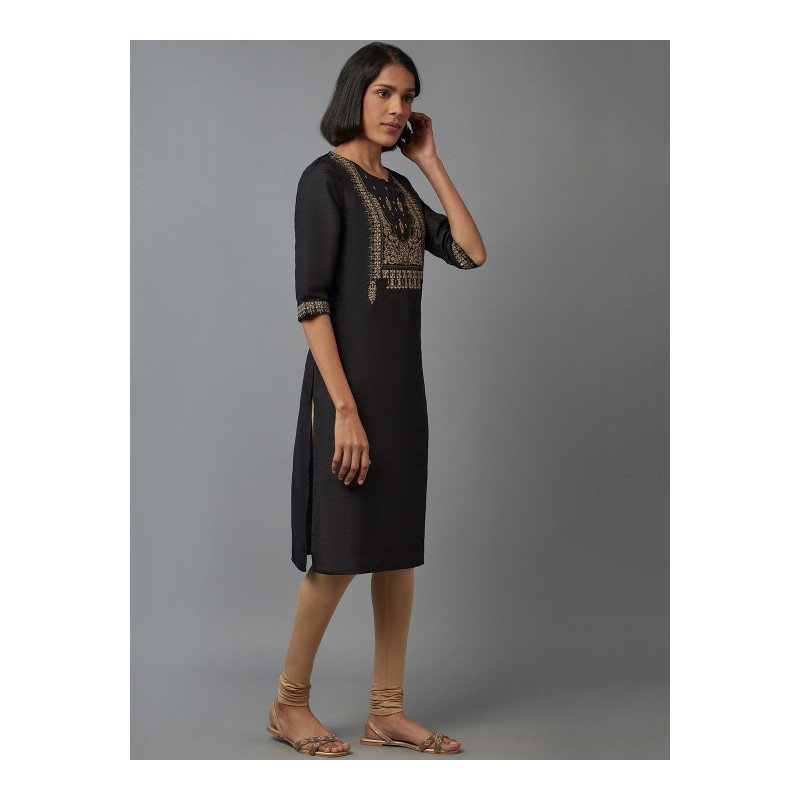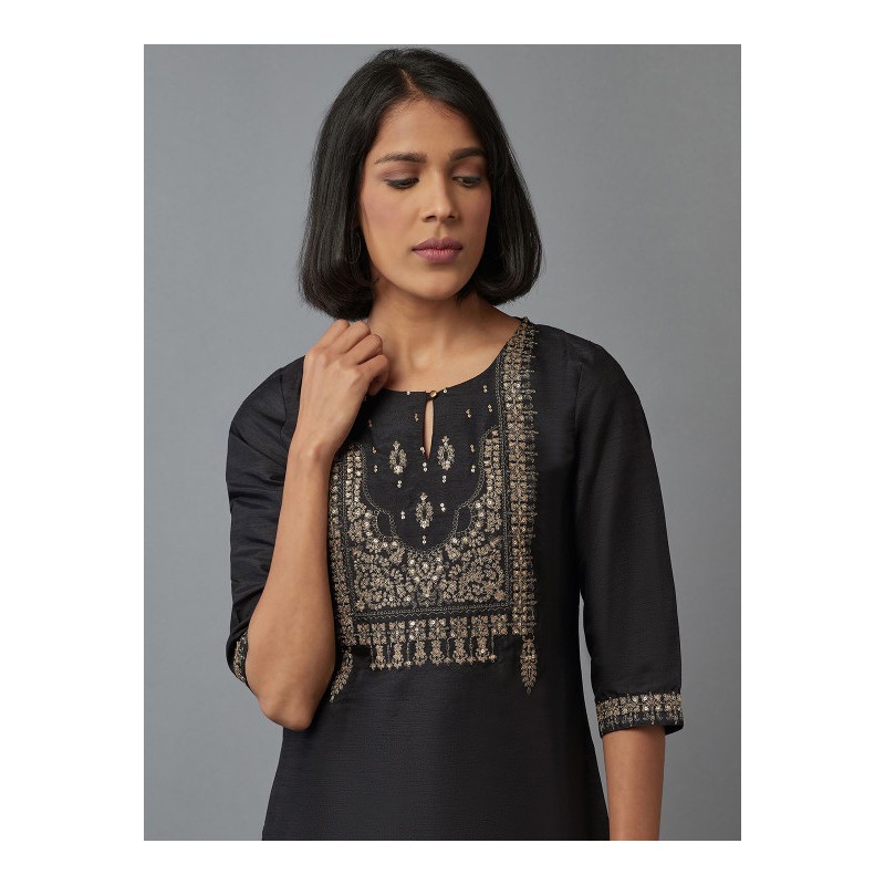 Дизайнерская индийская туника черного цвета с вышивкой золотой нитью и мелкими золотыми пайетками. Туника имеет прямой силуэт, рукава три четверти, округлый ворот с вырезом с пуговкой, разрезы по бокам.