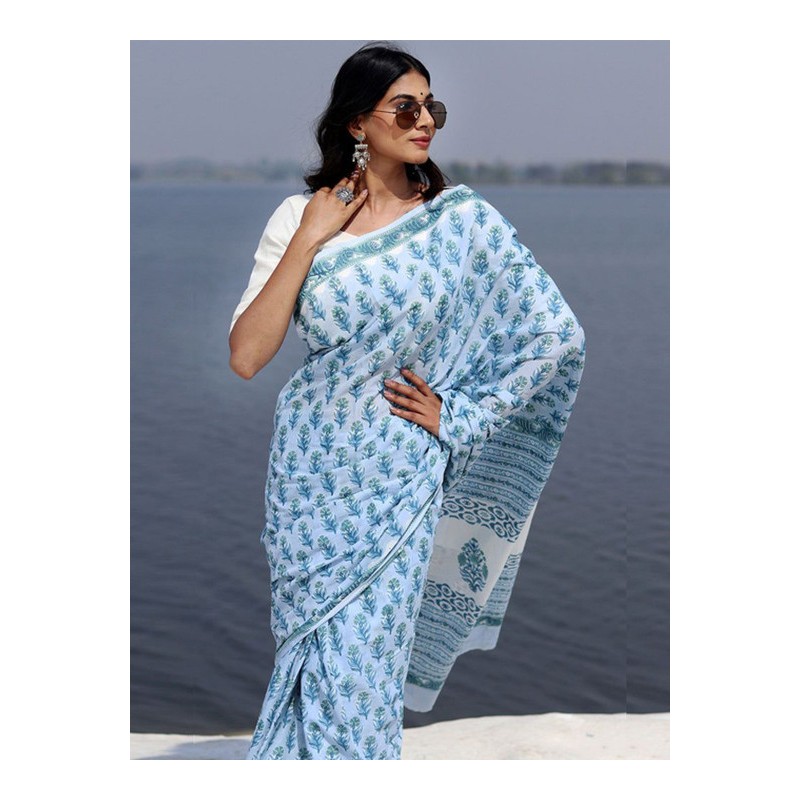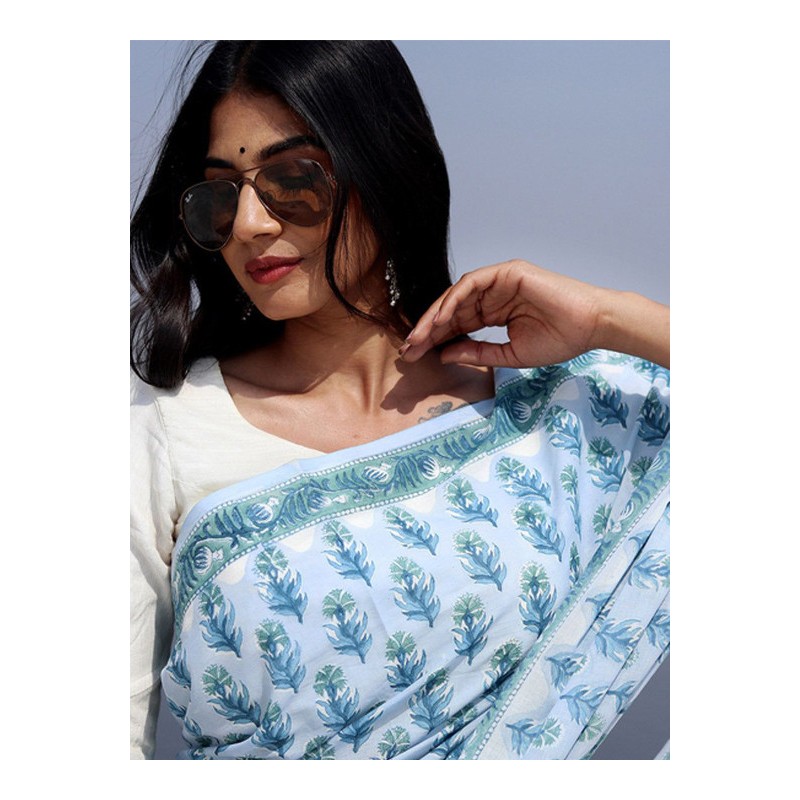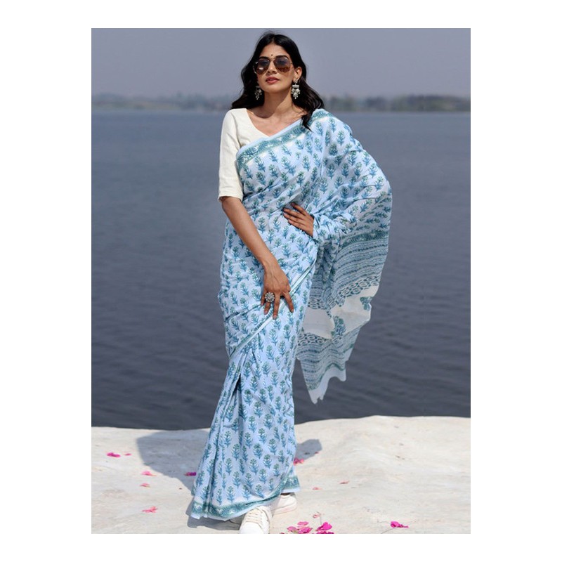 Индийское сари голубое с сине-зелеными цветами (принт)