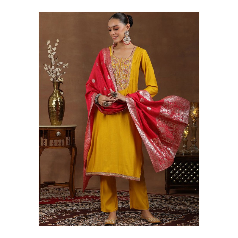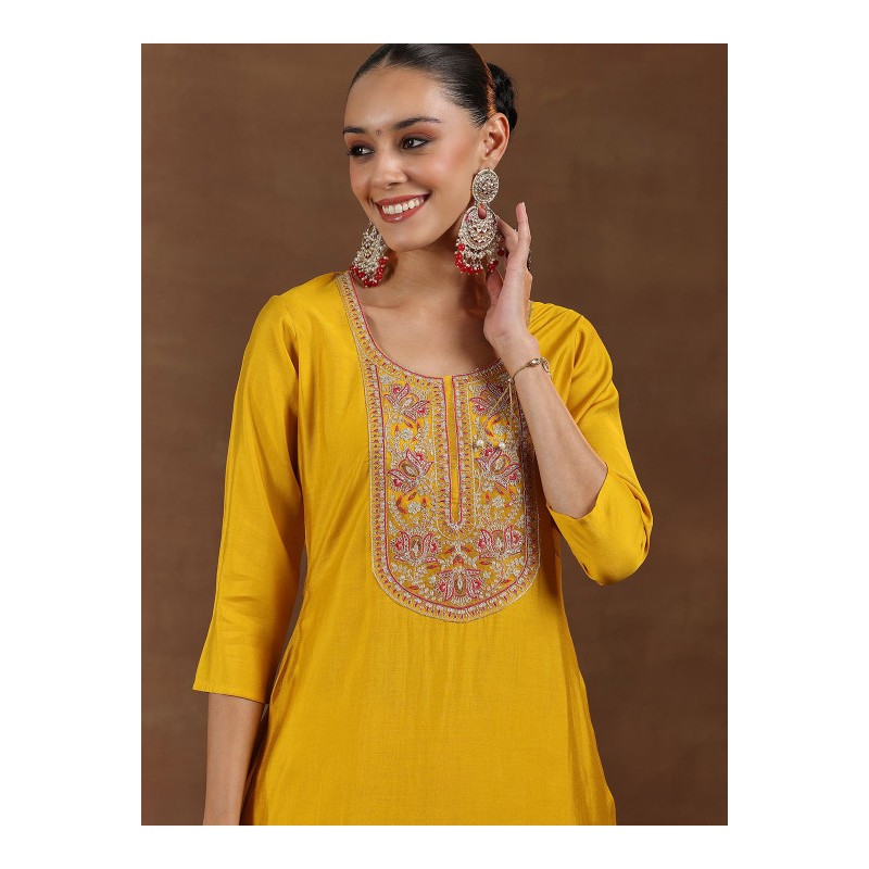 Индийский костюм сальвар камиз желтый c изящной вышивкой золотыми нитями и мелкими пайетками: