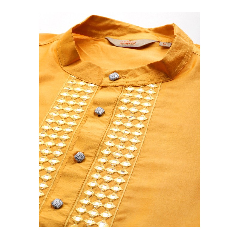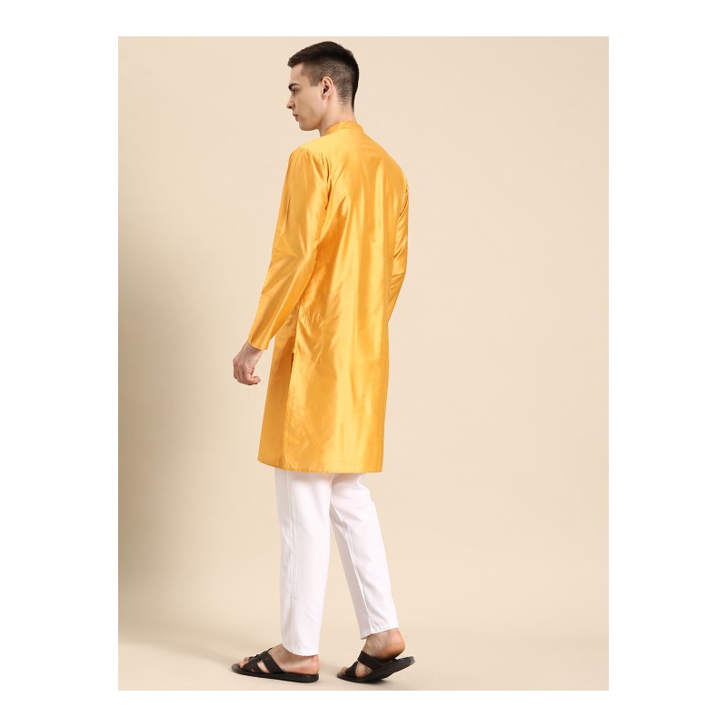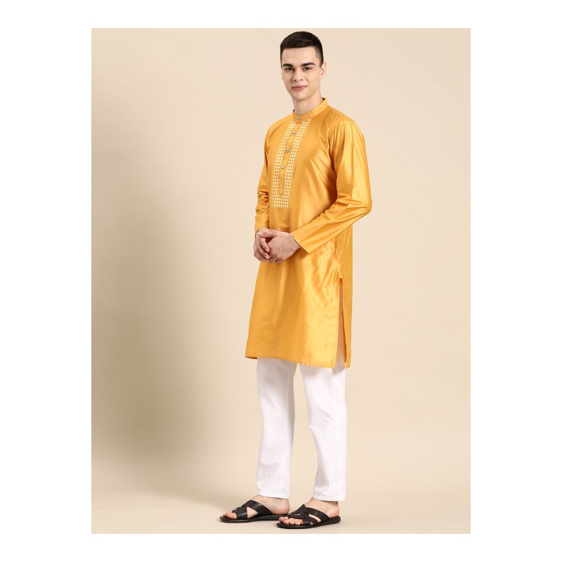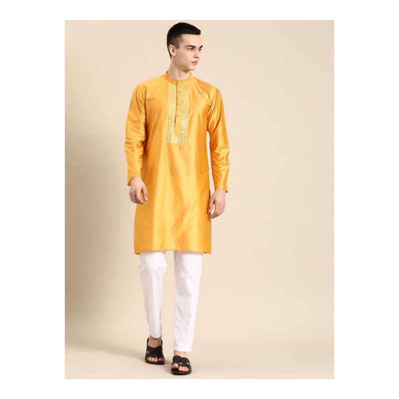 Индийская мужская длинная курта желтого цвета с вышивкой у горловины (имитация раджастанских зеркалец). Имеет китайский воротничок, ряд декоративных пуговиц, длинные рукава, карманы по бокам, разрезы по сторонам.