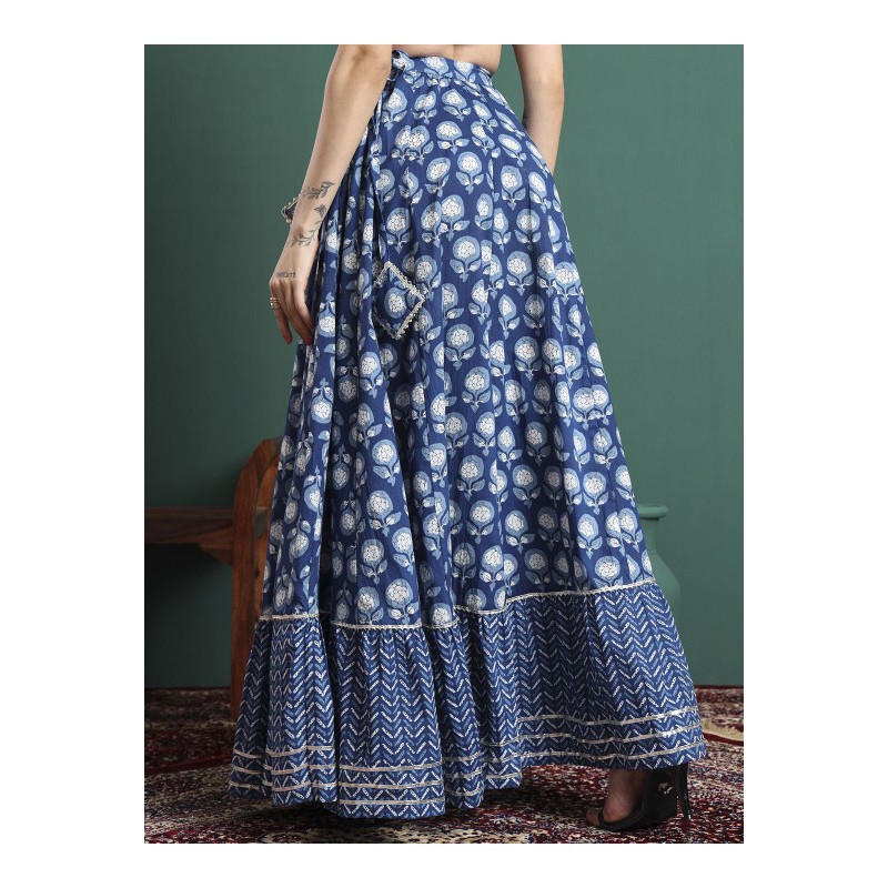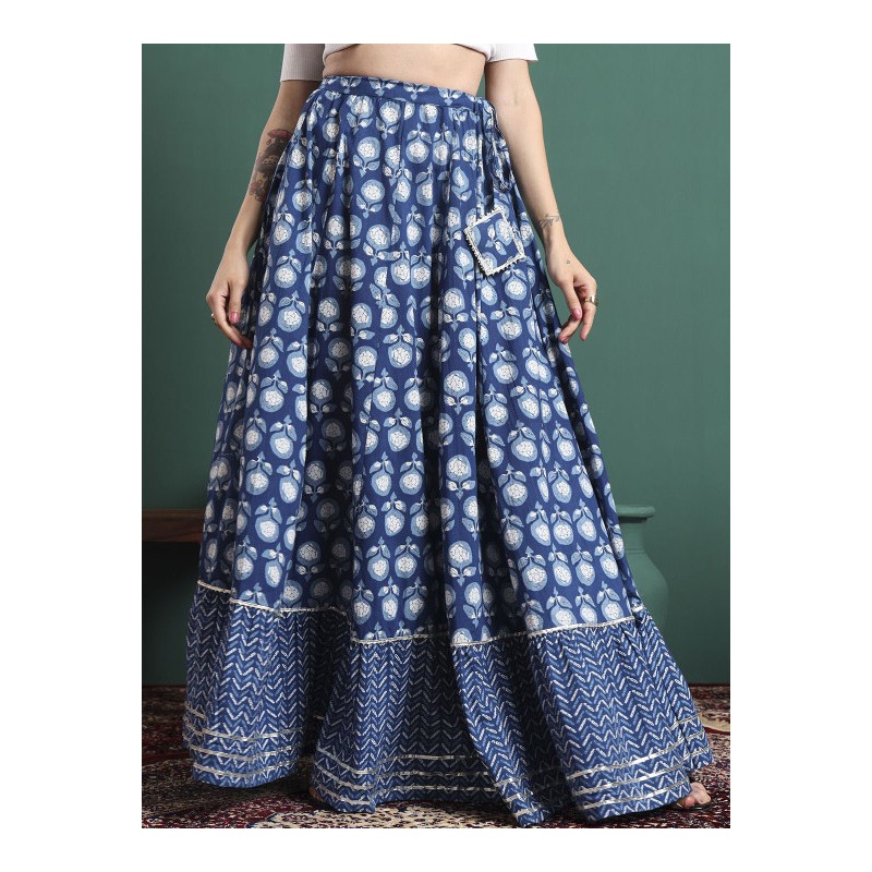 Длинная индийская юбка А-силуэта синего цвета с белыми цветами, на поясе кулиска со шнурком.