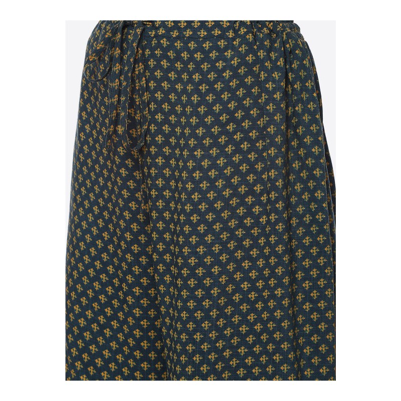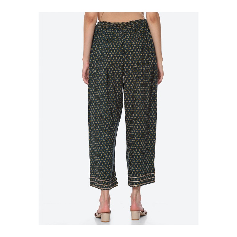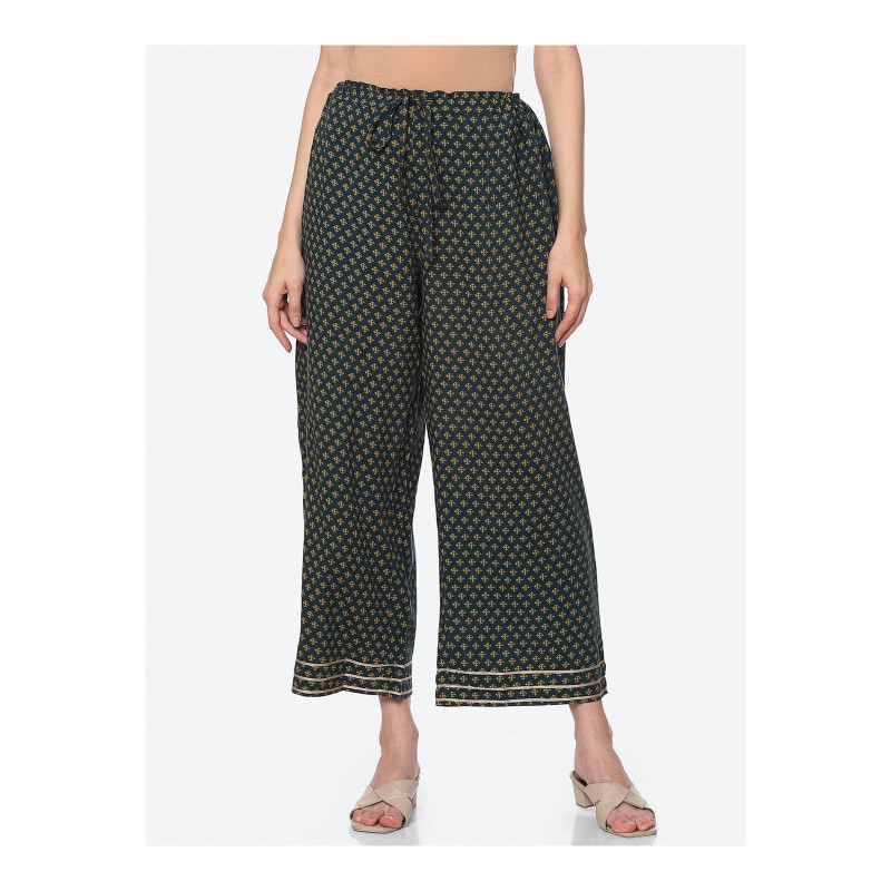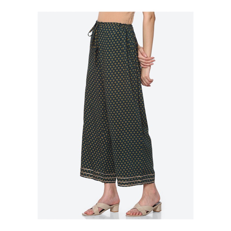 Индийские брюки зеленые с золотистой тесьмой на штанинах внизу и цветочным принтом. На поясе сзади резинка, спереди кулиска со шнурком для фиксации на талии.