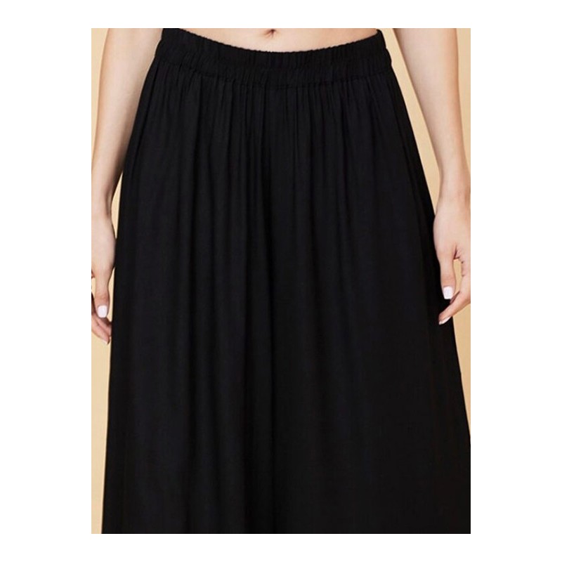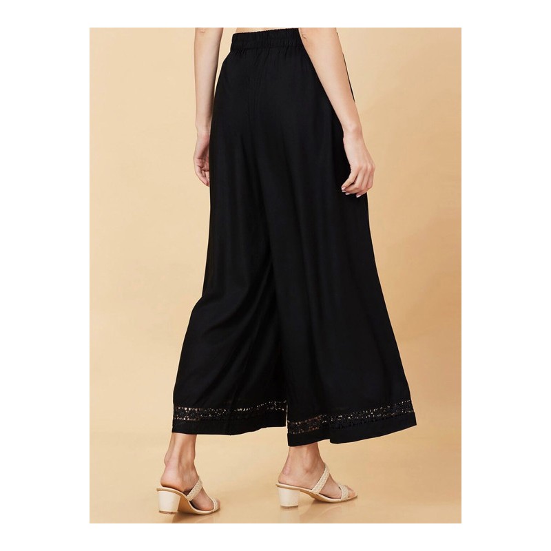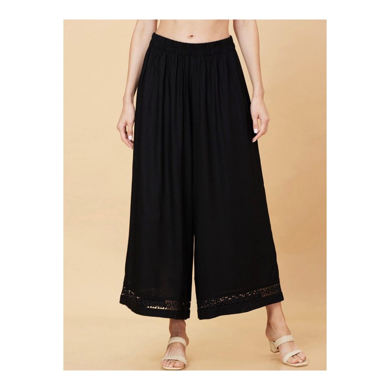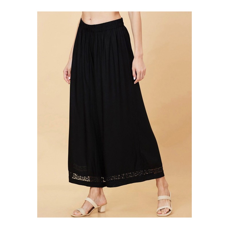Индийские штаны черные палаццо с кружевом внизу штанин. На поясе эластичная резинка.