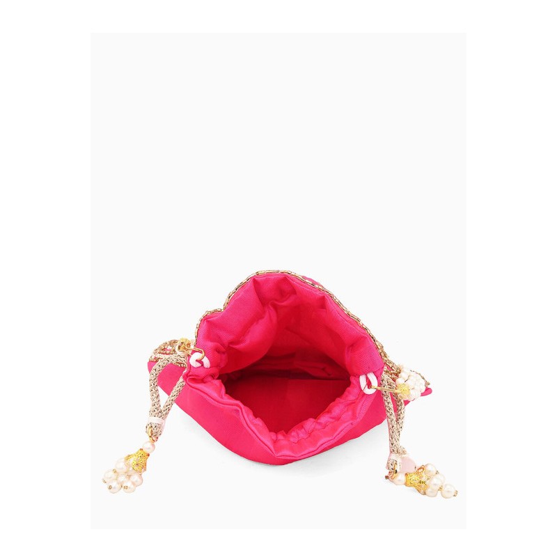 Индийская сумочка ярко розовая с вышивкой стеклярусом, бисером, пайетками, искусственным жемчугом. С ручкой из искусственного жемчуга.