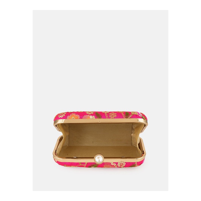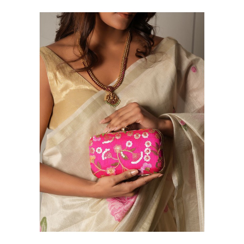 Индийская сумка клатч ярко розовая с вышивкой золотой и цветными нитями.