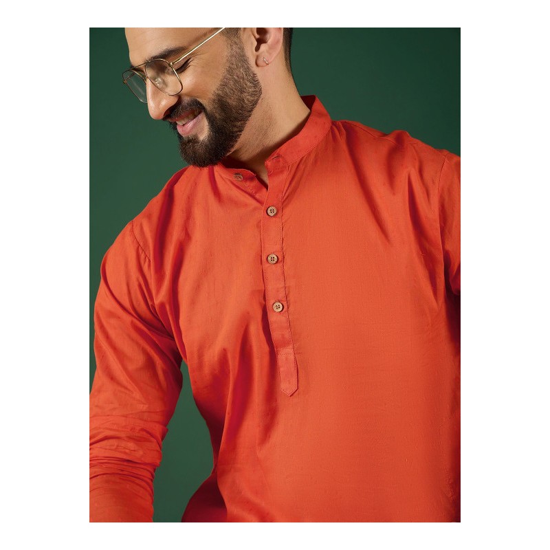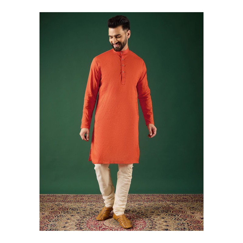 Индийская мужская длинная курта оранжевого цвета. Имеет китайский воротничок, ряд декоративных пуговиц, длинные рукава, карманы по бокам, разрезы по сторонам.