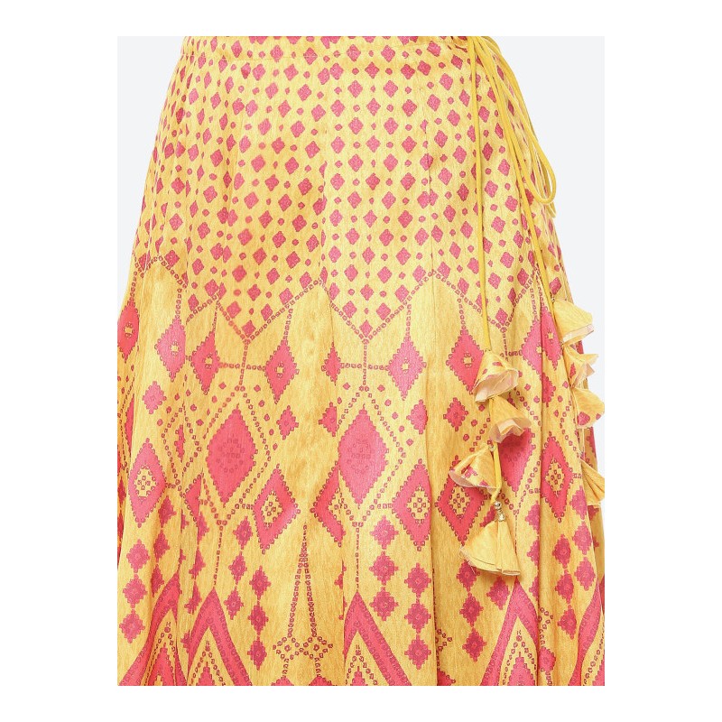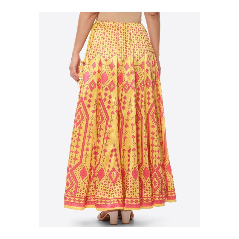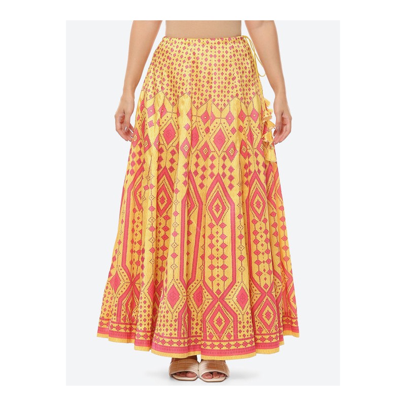 Длинная индийская юбка А-силуэта, на поясе кулиска со шнурком. Цвет у юбки желтый с розовыми узорами. Есть хлопковая подкладка.