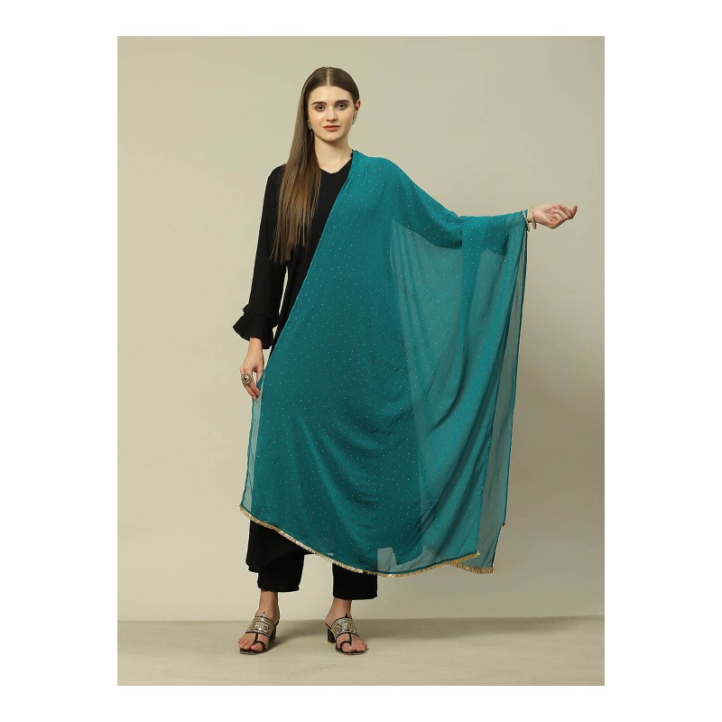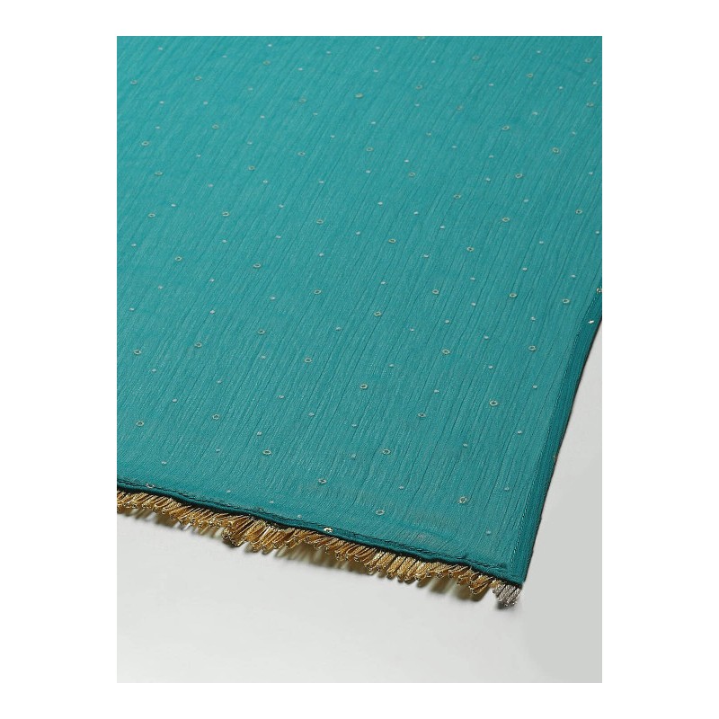 Дупатта бирюзовая с золотым принтом, по узкой части украшена тесьмой.