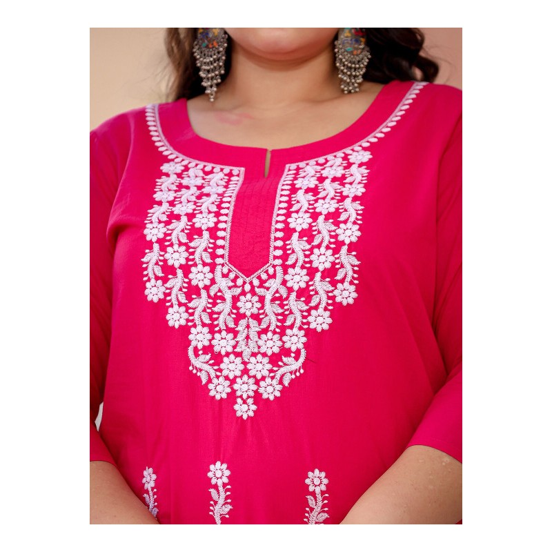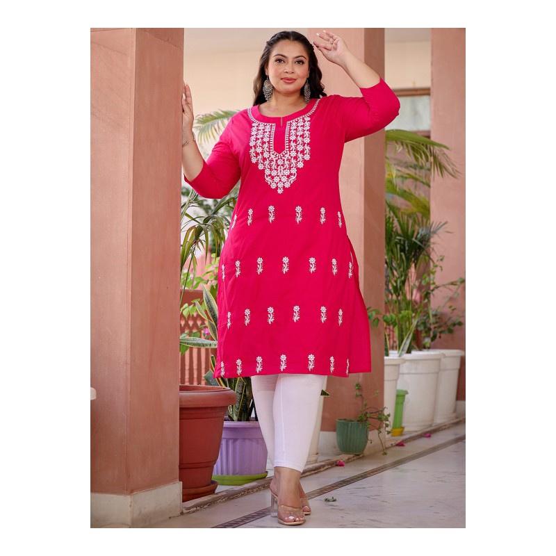 Индийская туника ярко розового цвета с вышивкой белой нитью. Туника имеет прямой силуэт, рукава три четверти, округлый ворот, разрезы по бокам.