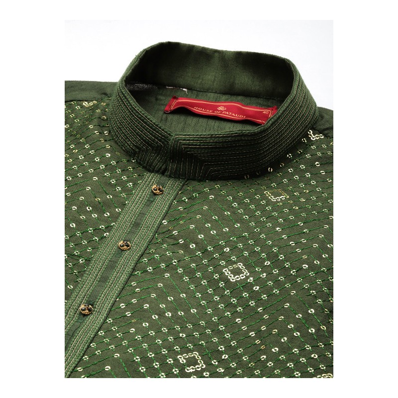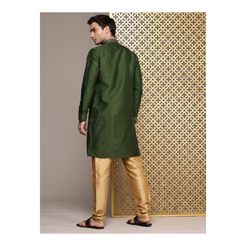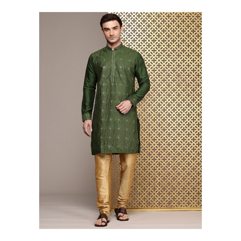 Индийская мужская курта зеленого (хаки) цвета с вышивкой зеленой нитью и мелкими золотыми пайетками. Имеет китайский воротничок, длинные рукава, разрезы по бокам, пара карманов, есть подкладка. В комплекте золотистые брюки чуридары, собираются на щиколотках гармошкой. На поясе кулиска со шнурком.