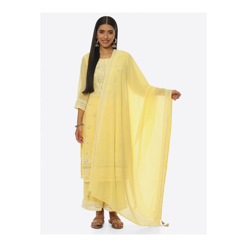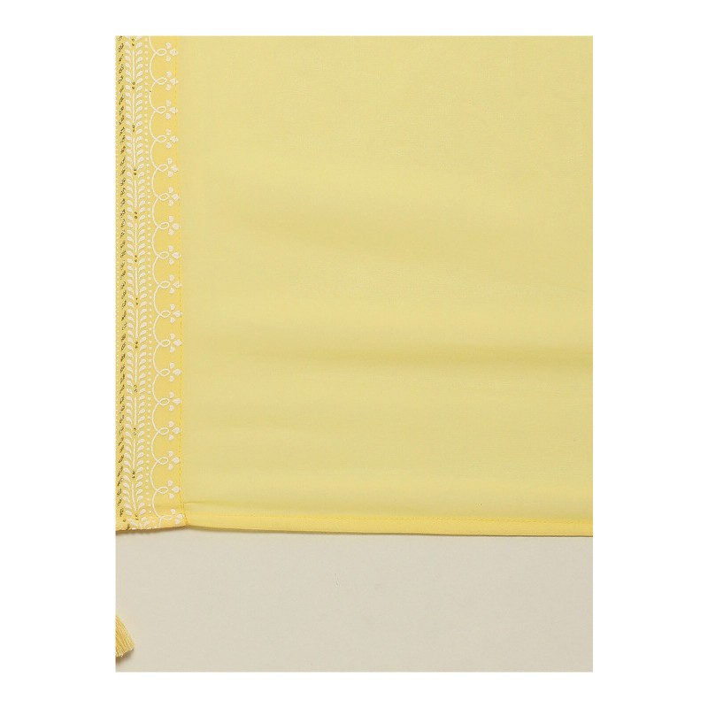 Дупатта желтая, по узкой части украшена тесьмой и кисточками на углах.