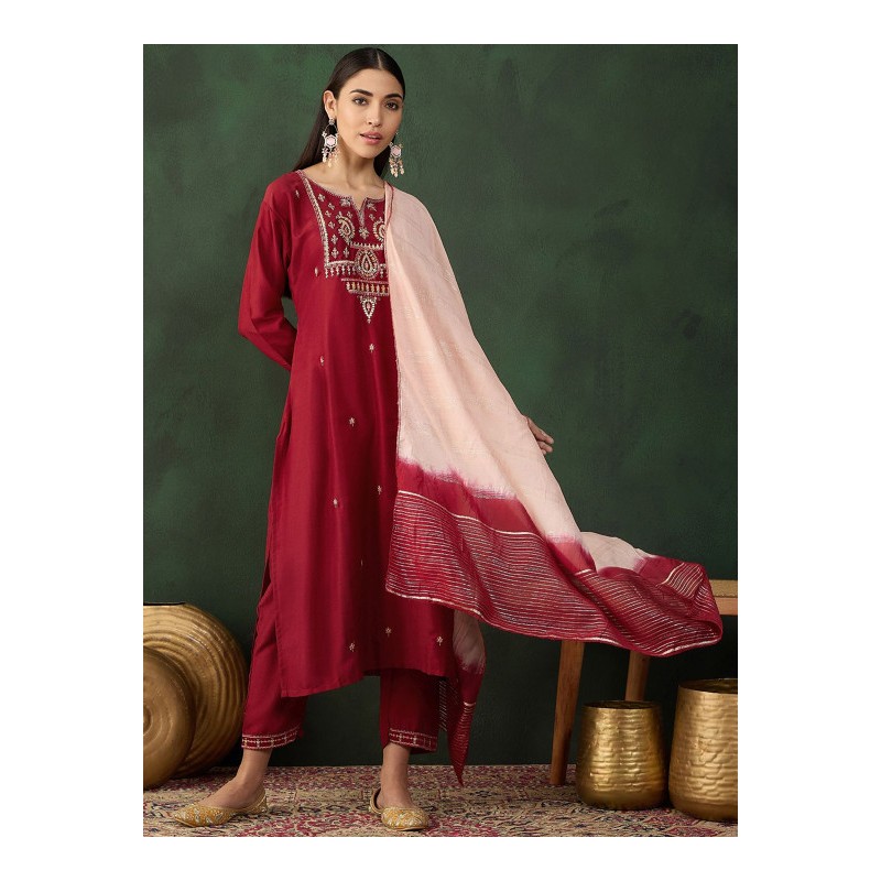 1) индийская туника бордовая с округлой горловиной, рукавами три четверти, прямым силуэтом, разрезами по бокам, изящной вышивкой цветными нитями