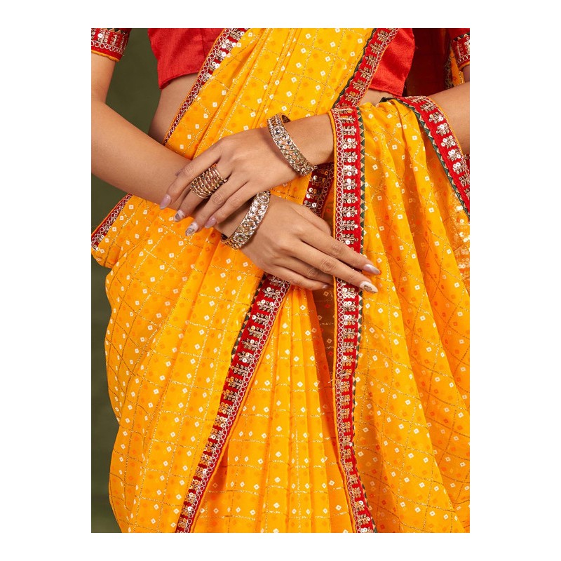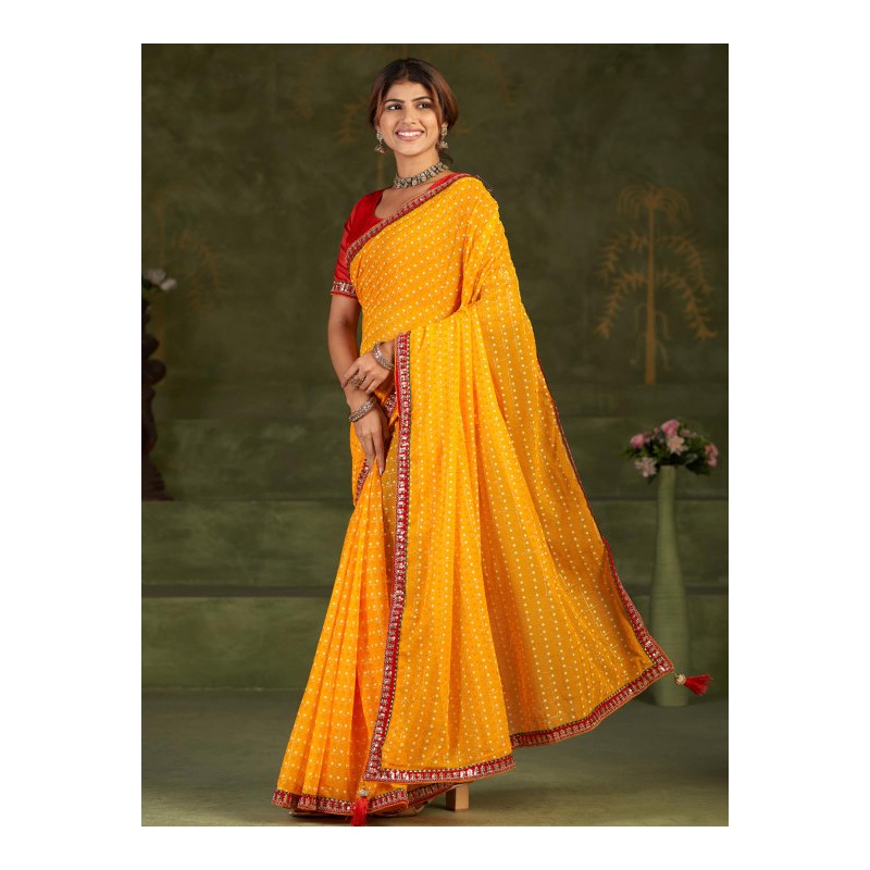 Индийское сари ярко желтого цвета (цвета манго) с принтом и контрастной красной каймой, вышитой золотом. Анчал украшают красные кисточки.