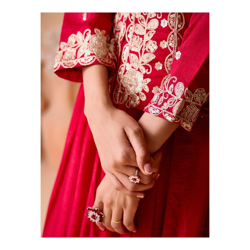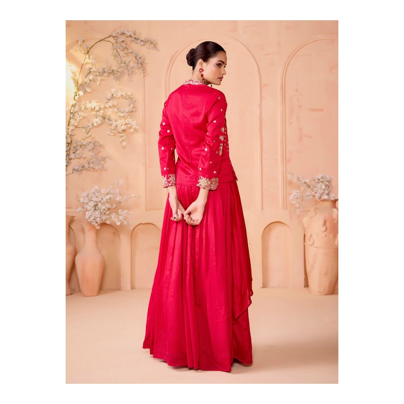 Блузка прямого кроя, с разрезами по бокам и по середине, рукавами три четверти, китайским воротничком, молния на спинке. Юбка пышная за счет складок, на поясе кулиска со шнурком, молния сбоку. Есть подкладка и у блузки, и у юбки.