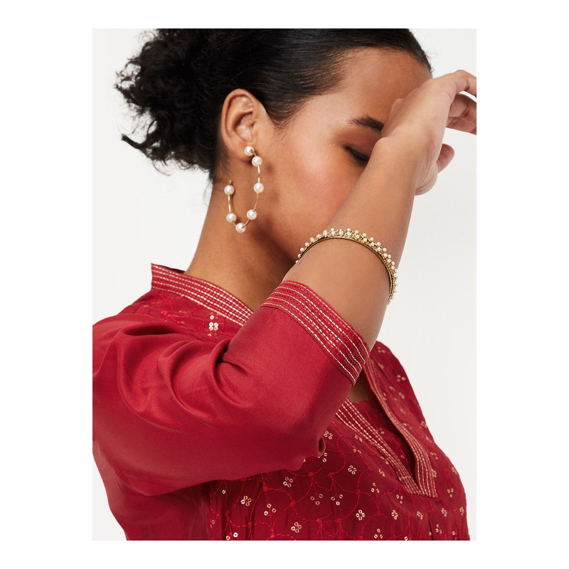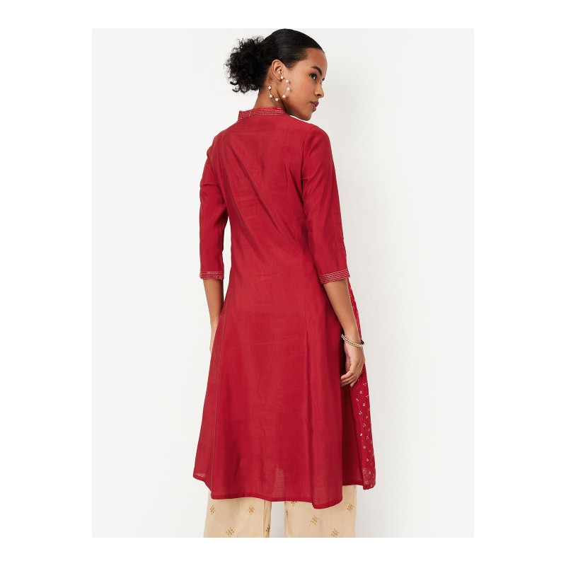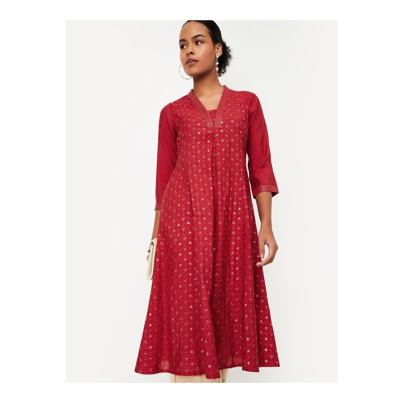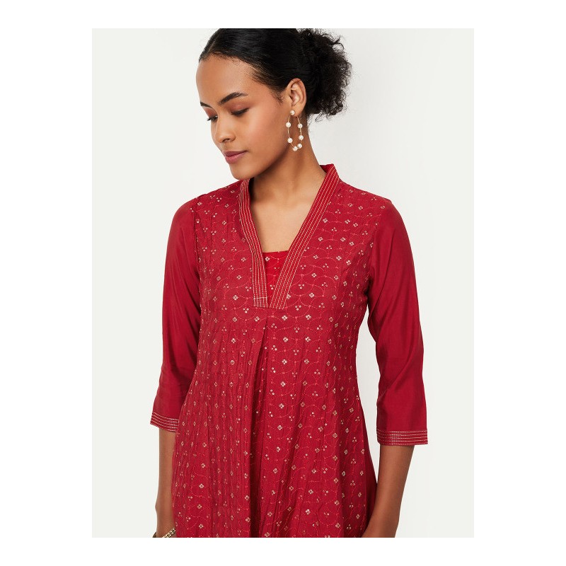 Индийская туника анаркали А-силуэта глубокого красного цвета с изящной вышивкой нитью и пайетками. Туника имеет V-образный, рукава три четверти.