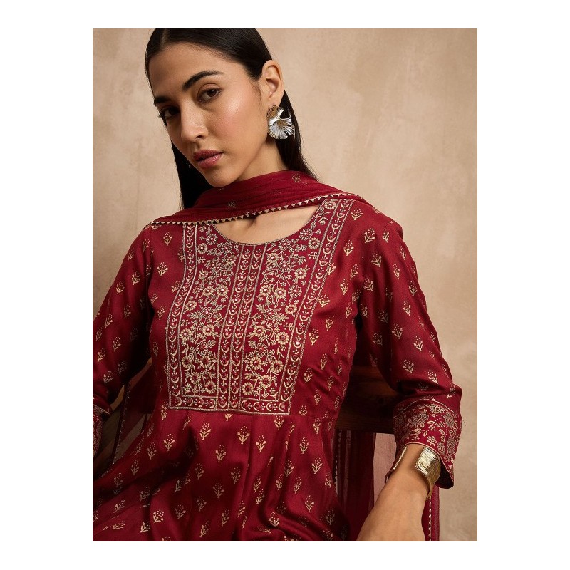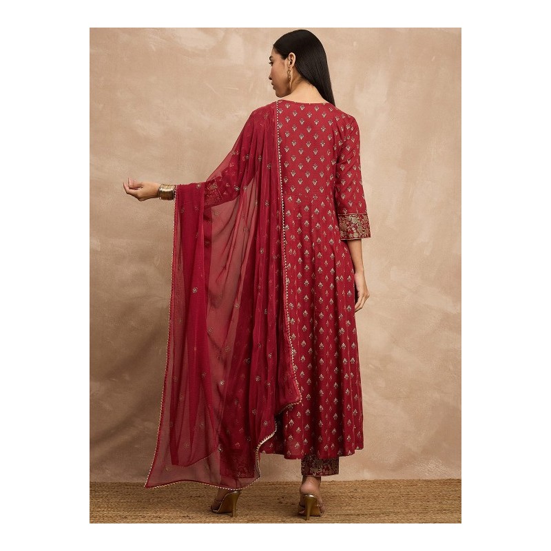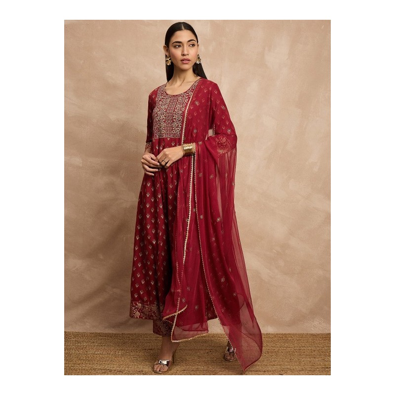 Индийский женский праздничный костюм бордовый c золотым печатным рисунком: