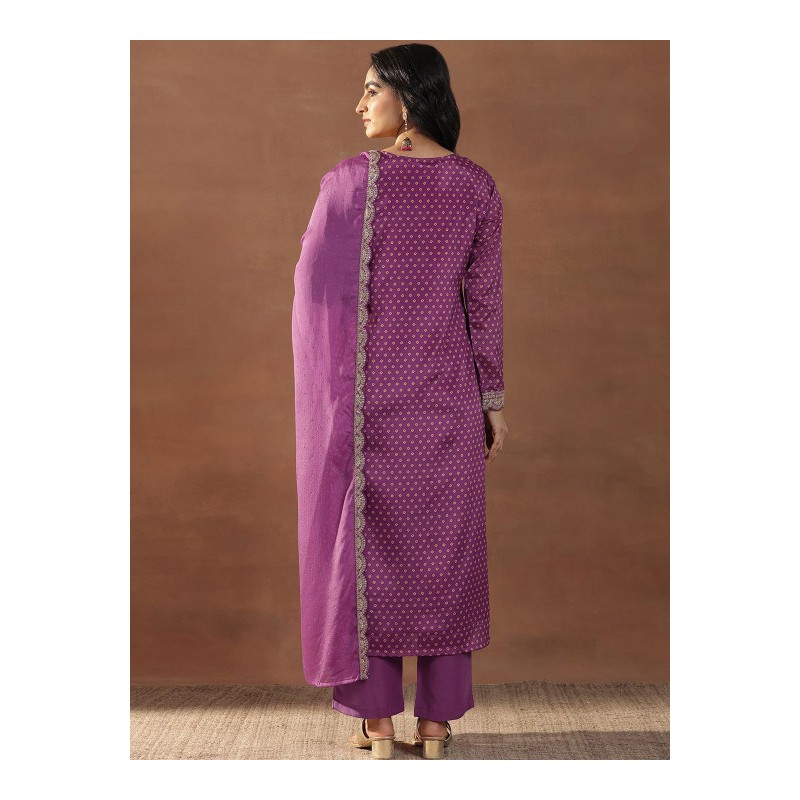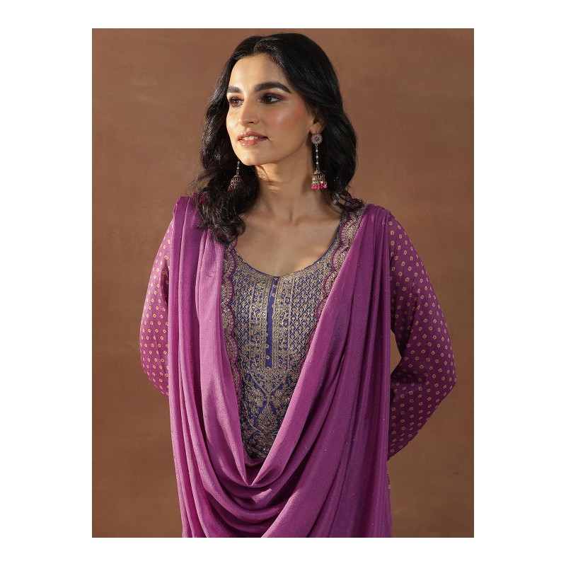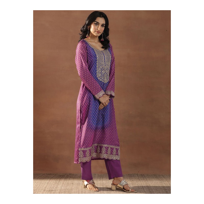Индийский женский брючный костюм фиолетовый c изящной вышивкой золотой нитью и мелкими пайетками: