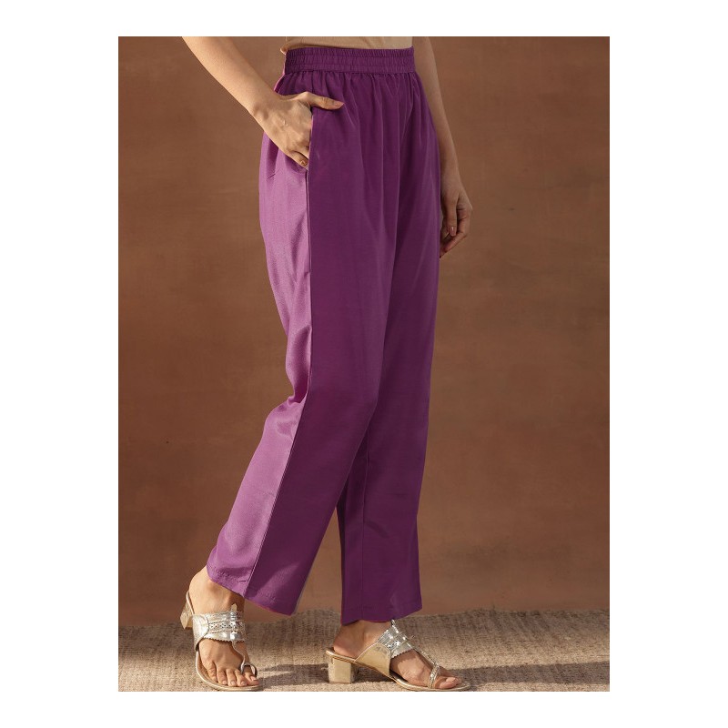 2) брюки однотонные в цвет фиолетовые, на поясе резинка, по бокам карманы;